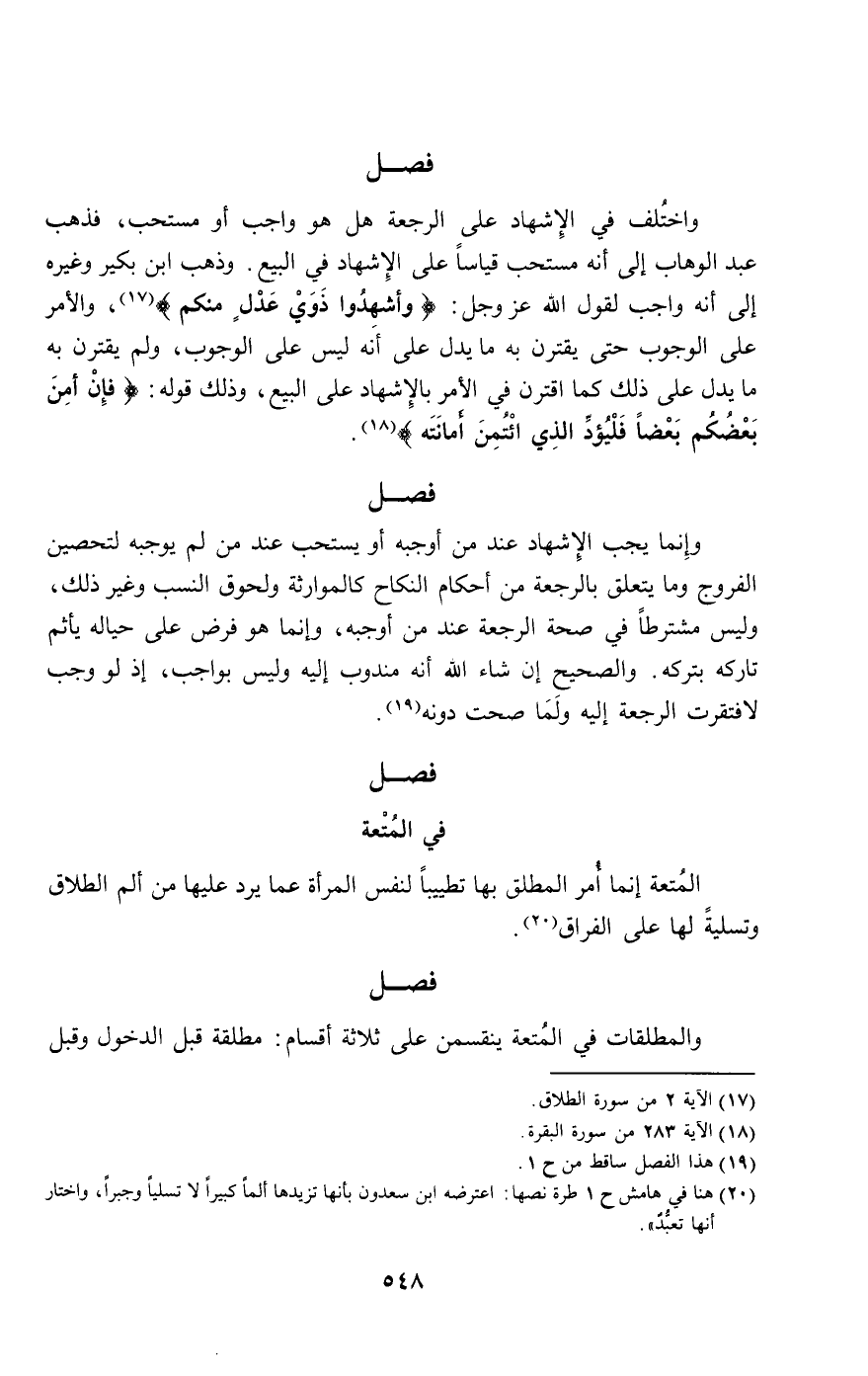 واختلف في الإشهاد على الرجعة هل هو واجب أو مستحب، فذهب عبد الوهاب إلى أنه مستحب قياسا على الإشهاد في البيع. وذهب ابن بكير وغيره إلى أنه واجب لقول الله عز وجل: {وَأَشْهِدُوا ذَوَيْ عَدْلٍ مِنْكُمْ} [الطلاق: 2]، والأمر على الوجوب حتى يقترن به ما يدل على أنه ليس على الوجوب، ولم يقترن به ما يدل على ذلك كما اقترن في الأمر بالإشهاد على البيع، وذلك قوله: {فَإِنْ أَمِنَ بَعْضُكُمْ بَعْضًا فَلْيُؤَدِّ الَّذِي اؤْتُمِنَ أَمَانَتَهُ} [البقرة: 283].