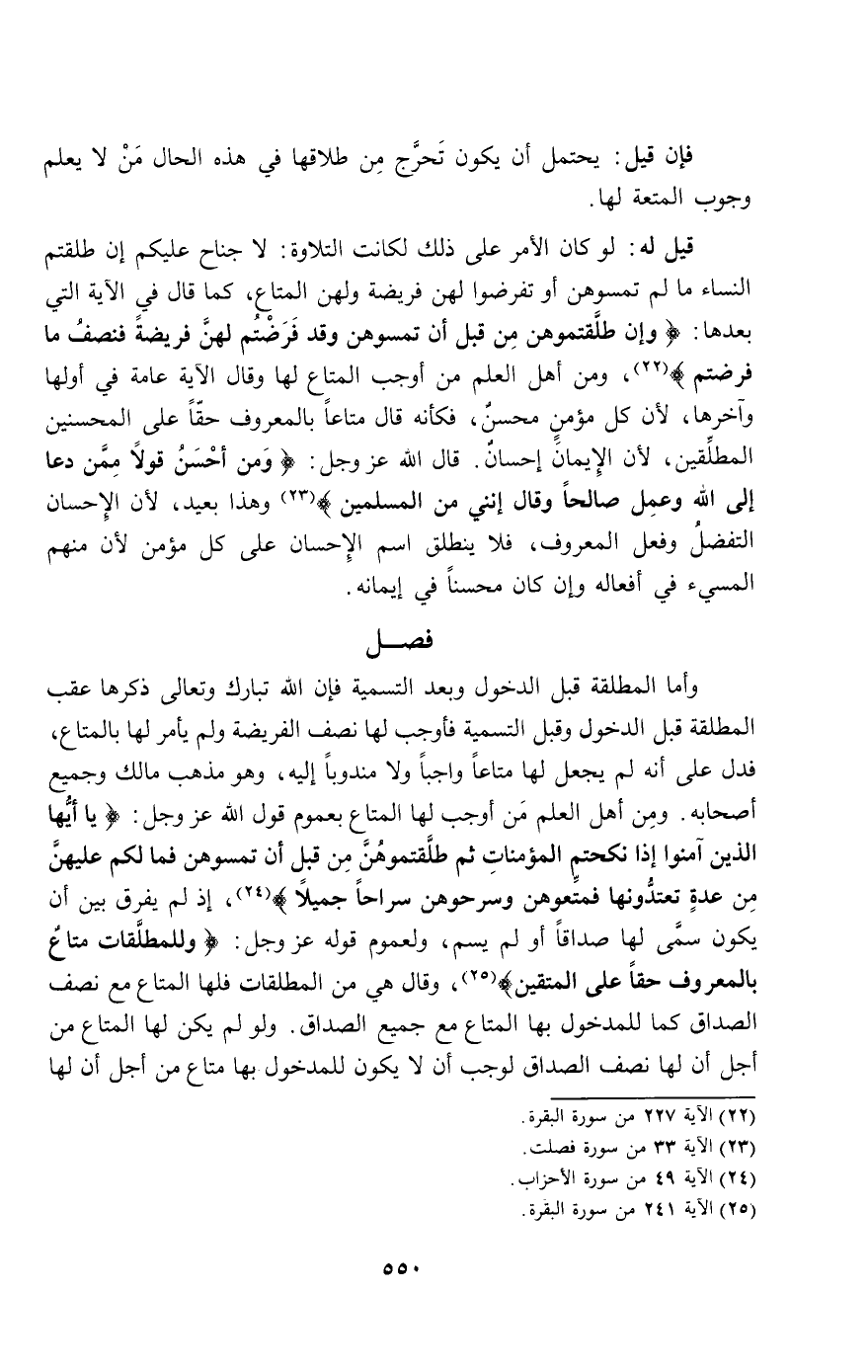 قيل له: لو كان الأمر على ذلك لكانت التلاوة: لا جناح عليكم إن طلقتم النساء ما لم تمسوهن أو تفرضوا لهن فريضة ولهن المتاع، كما قال في الآية التي بعدها: {وَإِنْ طَلَّقْتُمُوهُنَّ مِنْ قَبْلِ أَنْ تَمَسُّوهُنَّ وَقَدْ فَرَضْتُمْ لَهُنَّ فَرِيضَةً فَنِصْفُ مَا فَرَضْتُمْ} [البقرة: 237]، ومن أهل العلم من أوجب المتاع لها وقال الآية عامة في أولها وآخرها؛ لأن كل مؤمن محسن، فكأنه قال متاعا بالمعروف حقا على المحسنين المطلقين؛ لأن الإيمان إحسان. قال الله عز وجل: {وَمَنْ أَحْسَنُ قَوْلا مِمَّنْ دَعَا إِلَى اللَّهِ وَعَمِلَ صَالِحًا وَقَالَ إِنَّنِي مِنَ الْمُسْلِمِينَ} [فصلت: 33] وهذا بعيد؛ لأن الإحسان التفضل وفعل المعروف، فلا ينطلق اسم الإحسان على كل مؤمن؛ لأن منهم المسيء في أفعاله وإن كان محسنا في إيمانه.