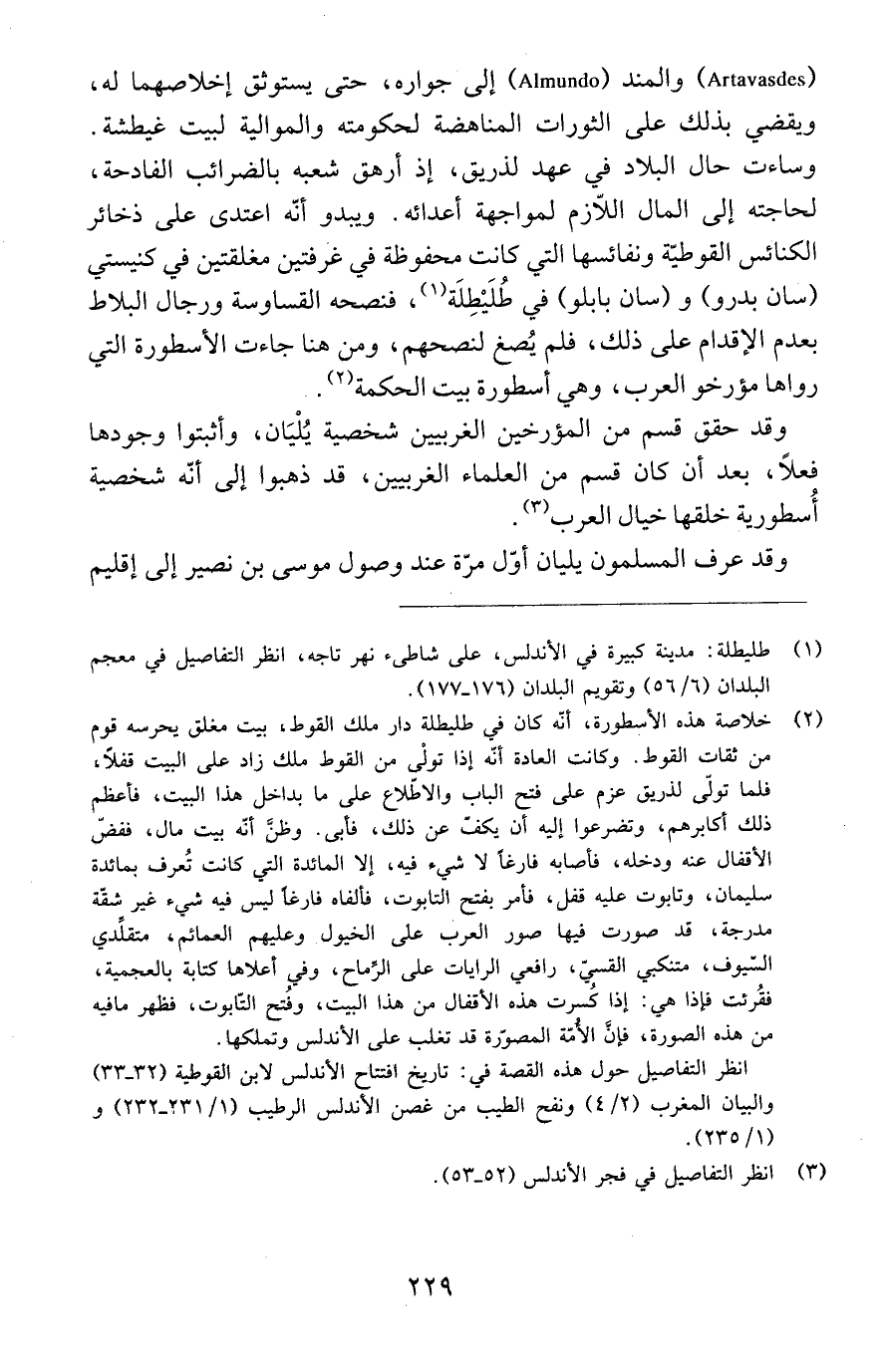 (2) خلاصة هذه الأسطورة، أنّه كان في طليطلة دار ملك القوط، بيت مغلق يحرسه قوم من ثقات القوط. وكانت العادة أنه إذا تولّى من القوط ملك زاد على البيت قفلاً، فلما تولّى لذريق عزم على فتح الباب والاطّلاع على ما بداخل هذا البيت، فأعظم ذلك أكابرهم، وتضرعوا إليه أن يكفّ عن ذلك، فأبى. وظنَّ أنّه بيت مال، ففضّ الأقفال عنه ودخله، فأصابه فارغاً لا شيء فيه، إلا المائدة التي كانت تُعرف بمائدة سليمان، وتابوت عليه قفل، فأمر بفتح التابوت، فألفاه فارغاً ليس فيه شيء غير شقّة مدرجة، قد صورت فيها صور العرب على الخيول وعليهم العمائم، متقلّدي السّيوف، متنكبي القسيّ، رافعي الرايات على الرِّماح، وفي أعلاها كتابة بالعجمية، فقُرئت فإذا هي: إذا كُسرت هذه الأقفال من هذا البيت، وفُتح التّابوت، فظهر ما فيه من هذه الصورة، فإنَّ الأُمّة المصوّرة قد تغلب على الأندلس وتملكها.