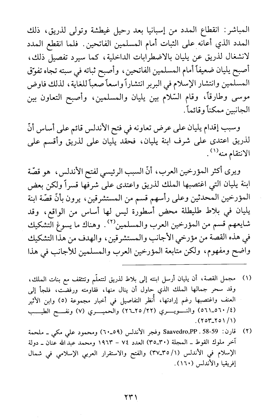 (2) قارن: Saavedra, PP.58-59 وفجر الأندلس (59 - 60) ومحمود علي مكي - ملحمة آخر ملوك القوط - المجلة (30 - 35) العدد 74 - 1963 ومحمد عبد الله عنان - دولة الإسلام في الأندلس (1/ 35 - 37) والفتح والاستقرار العربي الإسلامي في شمال إفريقيا والأندلس (160).