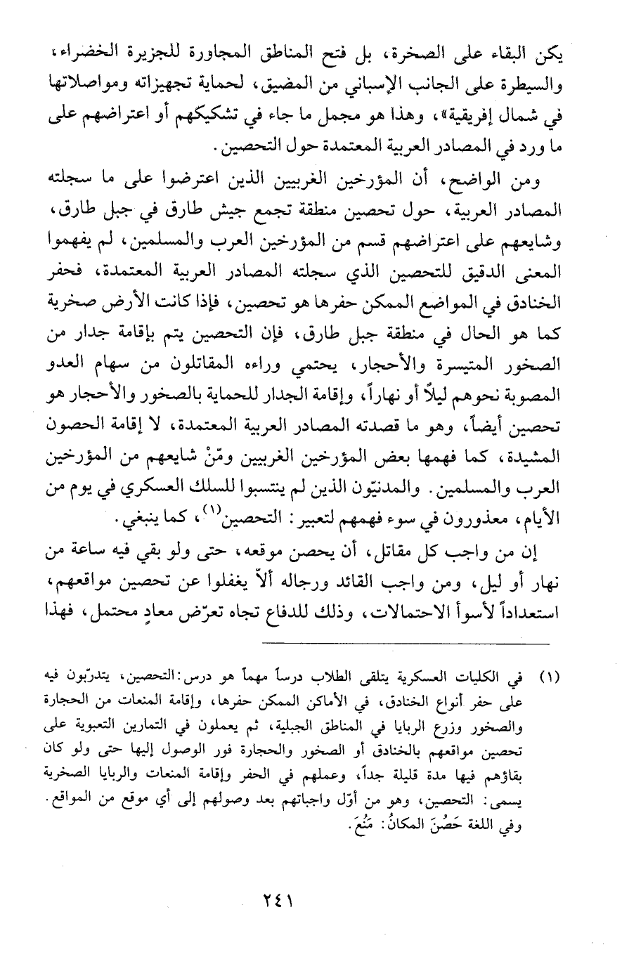 ومن الواضح، أن المؤرخين الغربيين الذين اعترضوا عى ما سجلته المصادر العربية، حول تحصين منطقة تجمع جيش طارق فى جبل طارق، وشايعهم على اعتراضهم قسم من المؤرخين العرب والمسلمين، لم يفهموا المعنى الدقيق للتحصين الذي سجلته المصادر العربية المعتمدة، فحفر الخنادق في المواضع الممكن حفرها هو تحصين، فإذا كانت الأرض صخرية كما هو الحال في منطقة جبل طارق، فإن التحصين يتم بإقامة جدار من الصخور المتيسرة والأحجار، يحتمي وراءه المقاتلون من سهام العدو المصوبة نحوهم ليلاً أو نهاراً، وإقامة الجدار للحماية بالصخور والأحجار هو تحصين أيضاً، وهو ما قصدته المصادر العربية المعتمدة، لا إقامة الحصون المشيدة، كما فهمها بعض المؤرخين الغربيين ومن شايعهم من المؤرخين العرب والمسلمين. والمدنيّون الذين لم ينتسبوا للسلك العسكري في يوم من الأيام، معذورون في سوء فهمهم لتعبير: التحصين (1)، كما ينبغي.