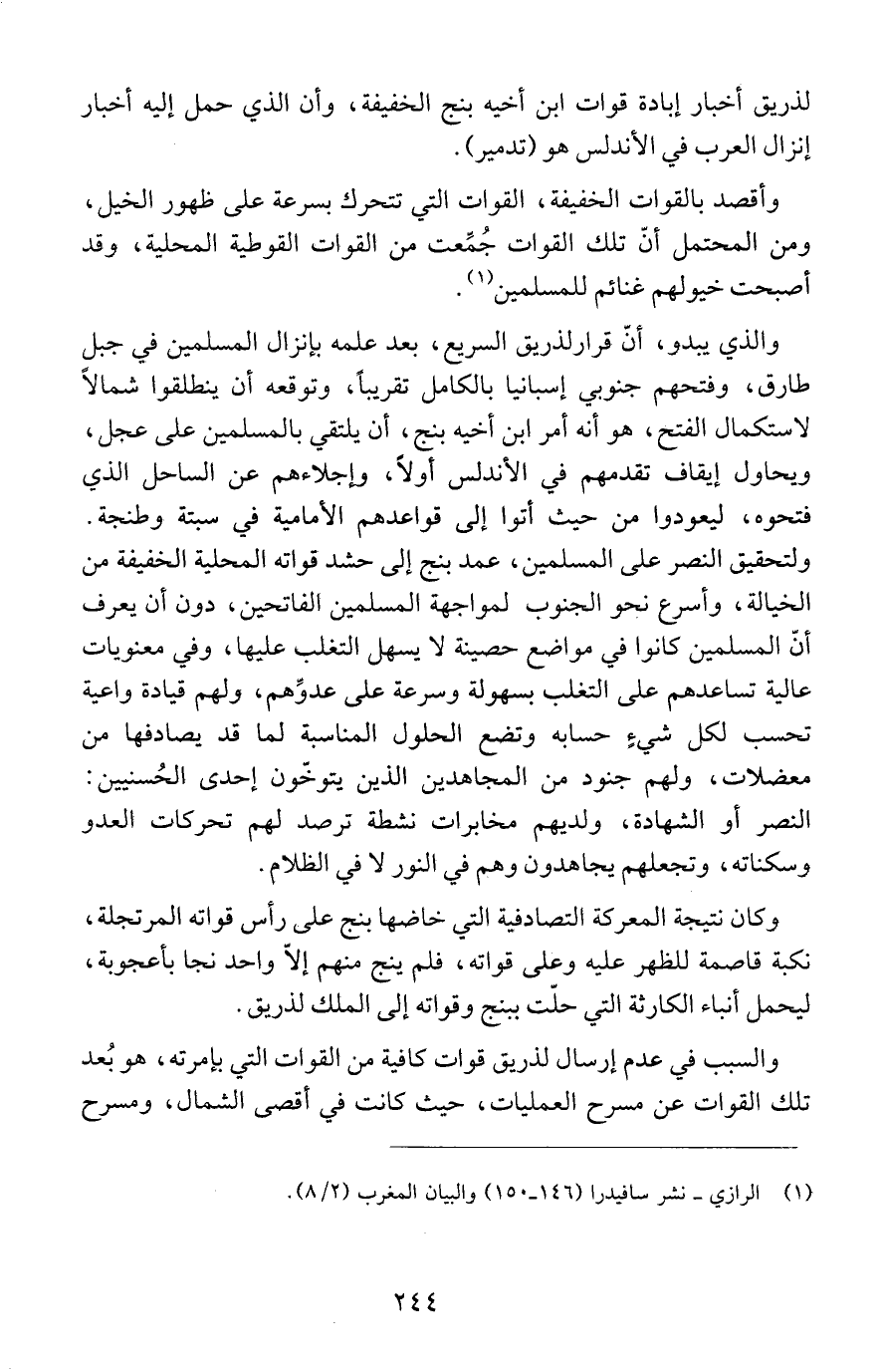 وأقصد بالقوات الخفيفة، القوات التي تتحرك بسرعة على ظهور الخيل، ومن المحتمل أنّ تلك القوات جُمِّعت من القوات القوطية المحلية، وقد أصبحت خيولهم غنائم للمسلمين (1).