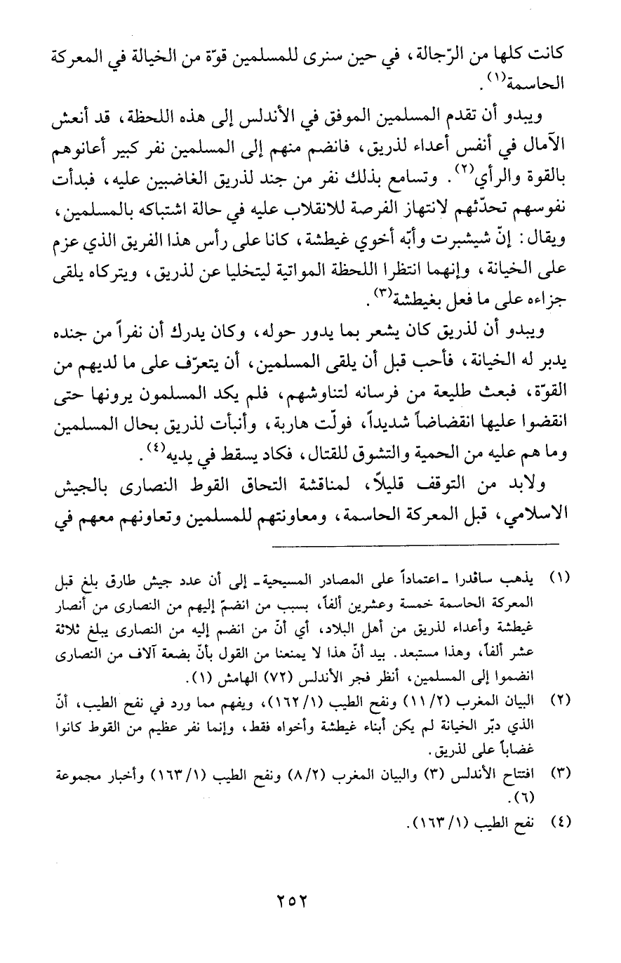 (2) البيان المغرب (2/ 11) ونفح الطيب (1/ 162)، ويفهم مما ورد في نفح الطيب، أنّ الذي دبّر الخيانة لم يكن أبناء غيطشة وأخواه فقط، وإنما نفر عظيم من القوط كانوا غضاباً على لذريق.