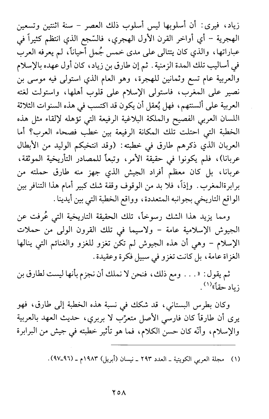 زياد، فيرى: أن أسلوبها ليس أسلوب ذلك العصر - سنة اثنتين وتسعين الهجرية - أي أواخر القرن الأول الهجري، فالسّجع الذي انتظم كثيراً في عباراتها، والذي كان يتتالى على مدى خمس جُمل أحياناً، لم يعرفه العرب في أساليب تلك المدة الزمنية. ثم إن طارق بن زياد، كان أول عهده بالإسلام والعربية عام تسع وثمانين للهجرة، وهو العام الذي استولى فيه موسى بن نصير على المغرب، فاستولى الإسلام على قلوب أهلها، واستولت لغته العربية على ألسنتهم، فهل يُعقل أن يكون قد اكتسب في هذه السنوات الثلاثة اللسان العربي الفصيح والملكة البلاغية الرفيعة التي تؤهله لإلقاء مثل هذه الخطبة التي احتلت تلك المكانة الرفيعة بين خطب فصحاء العرب؟ أما العربان الذي ذكرهم طارق في خطبته: (وقد انتخبكم الوليد من الأبطال عرباناً)، فلم يكونوا في حقيقة الأمر، وتبعاً للمصادر التاريخية الموثقة، عرباناً، بل كان معظم أفراد الجيش الذي جهز منه طارق حملته من برابرة المغرب. وإذاً، فلا بد من الوقوف وقفة شك كبير أمام هذا التنافر بين الواقع التاريخي بجوانبه المتعددة، وواقع الخطبة التي بين أيدينا.
