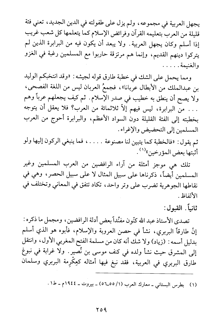 يجهل العربية في مجموعه، ولم يزل على طفولته في الدين الجديد، تعني فئة قليلة من العرب بتعليمه القرآن وفرائض الإسلام كما يتعلمها كل شعب غريب إذا أسلم وكان يجهل العربية. ولا يبعد أن يكون فيه من البرابرة الذين لم يتركوا دينهم القديم، وإنما هم مرتزقة حاربوا مع المسلمين رغبة في الغزو والغنيمة .....