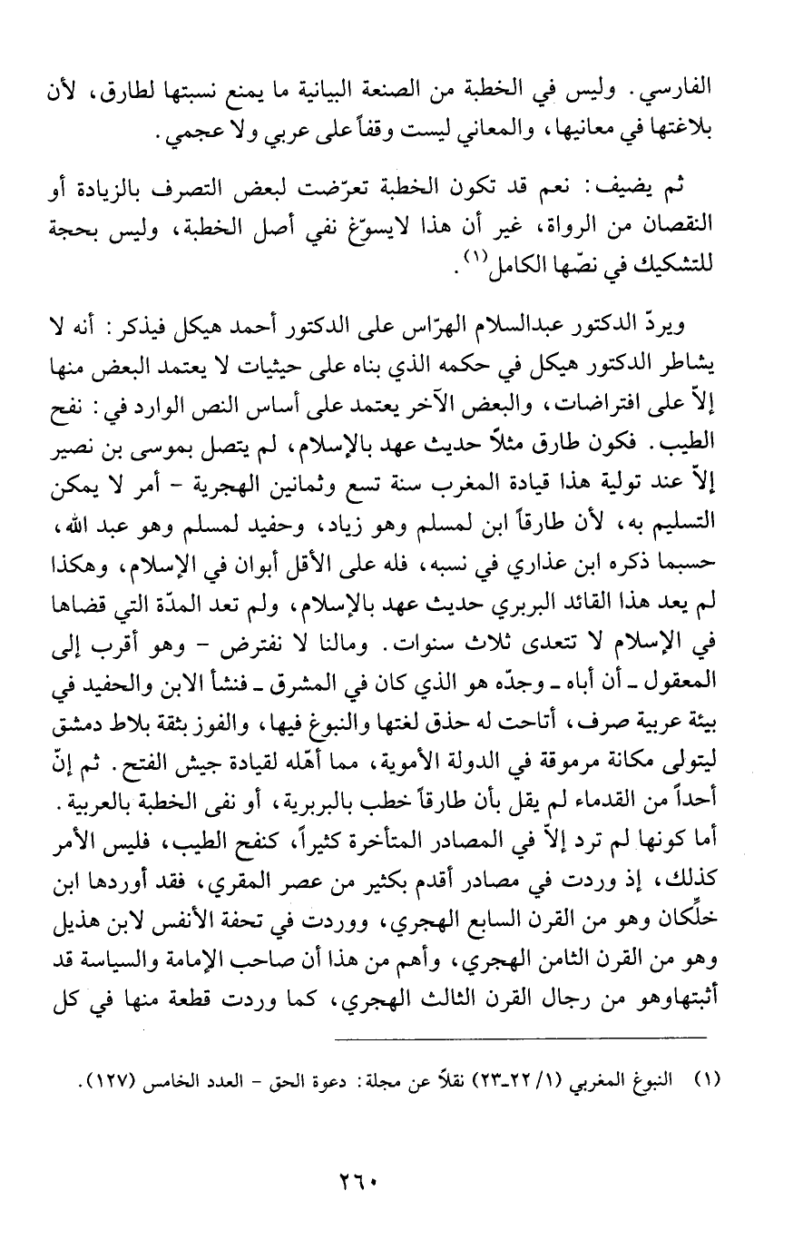 ويردّ الدكتور عبد السلام الهرّاس على الدكتور أحمد هيكل فيذكر: أنه لا يشاطر الدكتور هيكل في حكمه الذي بناه على حيثيات لا يعتمد البعض منها إلاّ على افتراضات، والبعض الآخر يعتمد على أساس النص الوارد في: نفح الطيب. فكون طارق مثلاً حديث عهد بالإسلام، لم يتصل بموسى بن نصير إلاّ عند تولية هذا قيادة المغرب سنة تسع وثمانين الهجرية - أمر لا يمكن التسليم به، لأن طارقاً ابن لمسلم وهو زياد، وحفيد لمسلم وهو عبد الله، حسبما ذكره ابن عذاري في نسبه، فله على الأقل أبوان في الإسلام، وهكذا لم يعد هذا القائد البربري حديث عهد بالإسلام، ولم تعد المدّة التي قضاها في الإسلام لا تتعدى ثلاث سنوات. ومالنا لا نفترض - وهو أقرب إلى المعقول - أن أباه - وجدّه هو الذي كان في المشرق - فنشأ الابن والحفيد في بيئة عربية صرف، أتاحت له حذق لغتها والنبوغ فيها، والفوز بثقة بلاط دمشق ليتولى مكانة مرموقة في الدولة الأموية، مما أهّله لقيادة جيش الفتح. ثم إنّ أحداً من القدماء لم يقل بأن طارقاً خطب بالبربرية، أو نفى الخطبة بالعربية. أما كونها لم ترد إلاّ في المصادر المتأخرة كثيراً، كنفح الطيب، فليس الأمر كذلك، إذ وردت في مصادر أقدم بكثير من عصر المقري، فقد أوردها ابن خلِّكان وهو من القرن السابع الهجري، ووردت في تحفة الأنفس لابن هذيل وهو من القرن الثامن الهجري، وأهم من هذا أن صاحب الإمامة والسياسة قد أثبتها وهو من رجال القرن الثالث الهجري، كما وردت قطعة منها في كل