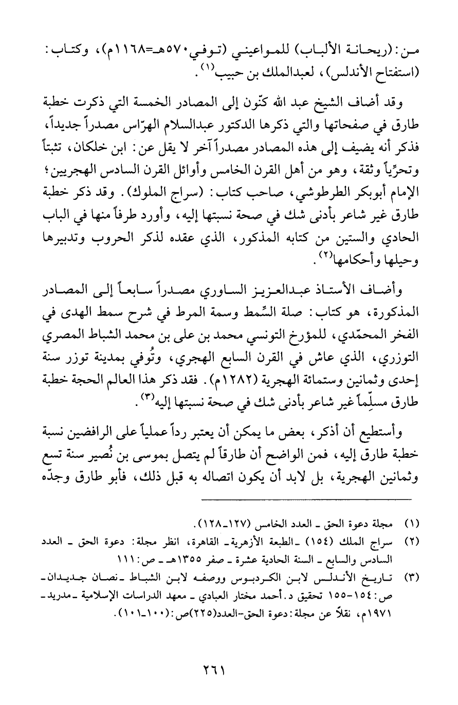 وقد أضاف الشيخ عبد الله كنّون إلى المصادر الخمسة التي ذكرت خطبة طارق في صفحاتها والتي ذكرها الدكتور عبد السلام الهرّاس مصدراً جديداً، فذكر أنه يضيف إلى هذه المصادر مصدراً آخر لا يقل عن: ابن خلكان، تثبتاً وتحرِّياً وثقة، وهو من أهل القرن الخامس وأوائل القرن السادس الهجريين؛ الإمام أبو بكر الطرطوشي، صاحب كتاب: (سراج الملوك). وقد ذكر خطبة طارق غير شاعر بأدنى شك في صحة نسبتها إليه، وأورد طرفاً منها في الباب الحادي والستين من كتابه المذكور، الذي عقده لذكر الحروب وتدبيرها وحيلها وأحكامها (2).