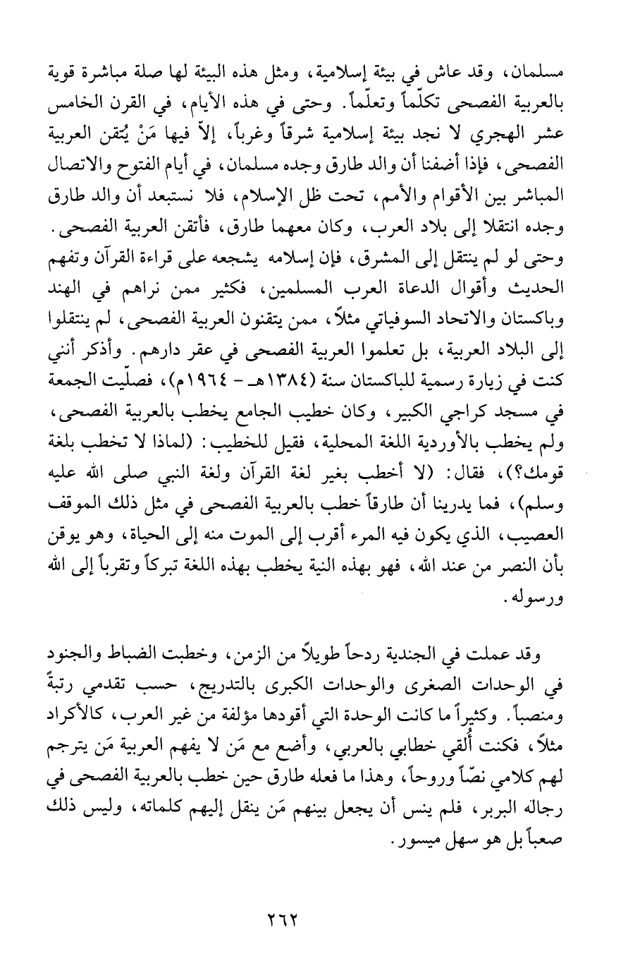 وقد عملت في الجندية ردحاً طويلاً من الزمن، وخطبت الضباط والجنود في الوحدات الصغرى والوحدات الكبرى بالتدريج، حسب تقدمي رتبةً ومنصباً. وكثيراً ما كانت الوحدة التي أقودها مؤلفة من غير العرب، كالأكراد مثلاً، فكنت ألقي خطابي بالعربي، وأضع مع مَن لا يفهم العربية مَن يترجم لهم كلامي نصّاً وروحاً، وهذا ما فعله طارق حين خطب بالعربية الفصحى في رجاله البربر، فلم ينس أن يجعل بينهم مَن ينقل إليهم كلماته، وليس ذلك صعباً بل هو سهل ميسور.