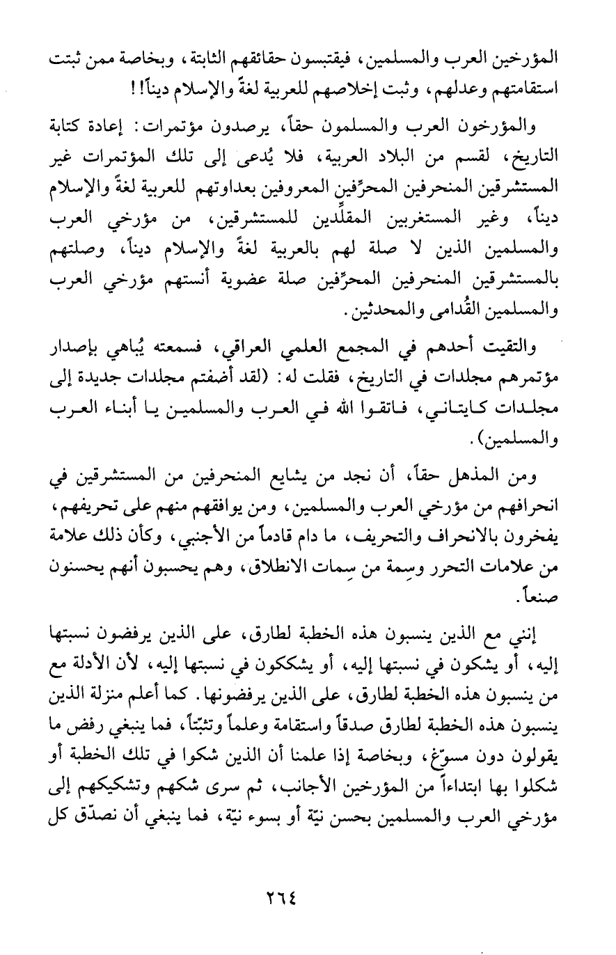 والتقيت أحدهم في المجمع العلمى العراقي، فسمعته يُباهي بإصدار مؤتمرهم مجلدات في التاريخ، فقلت له: (لقد أضفتم مجلدات جديدة إلى مجلدات كايتاني، فاتقوا الله في العرب والمسلمين يا أبناء العرب والمسلمين).