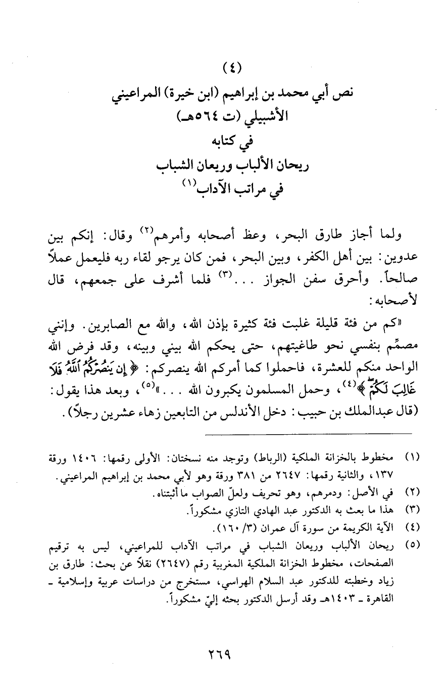 (5) ريحان الألباب وريعان الشباب في مراتب الآداب للمراعيني، ليس به ترقيم الصفحات، مخطوط الخزانة الملكية المغربية رقم (2647) نقلاً عن بحث: طارق بن زياد وخطبته للدكتور عبد السلام الهراسي، مستخرج من دراسات عربية وإسلامية - الفاهرة - 1403 هـ وقد أرسل الدكتور بحثه إليّ مشكوراً.