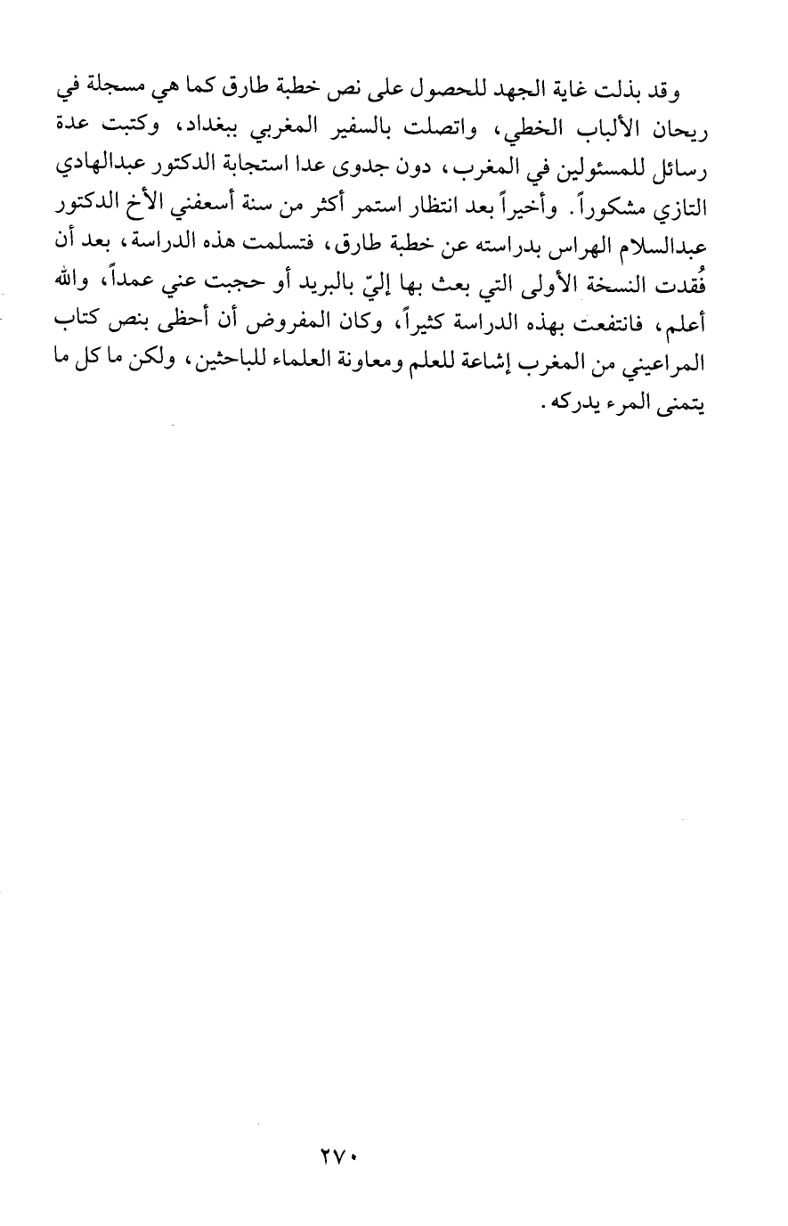 وقد بذلت غاية الجهد للحصول على نص خطبة طارق كما هي مسجلة في ريحان الألباب الخطي، واتصلت بالسفير المغربي ببغداد، وكتبت عدة رسائل للمسئولين في المغرب، دون جدوى عدا استجابة الدكتور عبد الهادي التازي مشكوراً. وأخيراً بعد انتظار استمر أكثر من سنة أسعفني الأخ الدكتور عبد السلام الهراس بدراسته عن خطبة طارق، فتسلمت هذه الدراسة، بعد أن فُقدت النسخة الأولى التي بعث بها إليّ بالبريد أو حجبت عني عمداً، والله أعلم، فانتفعت بهذه الدراسة كثيراً، وكان المفروض أن أحظى بنص كتاب المراعيني من المغرب إشاعة للعلم ومعاونة العلماء للباحثين، ولكن ما كل ما يتمنى المرء يدركه.