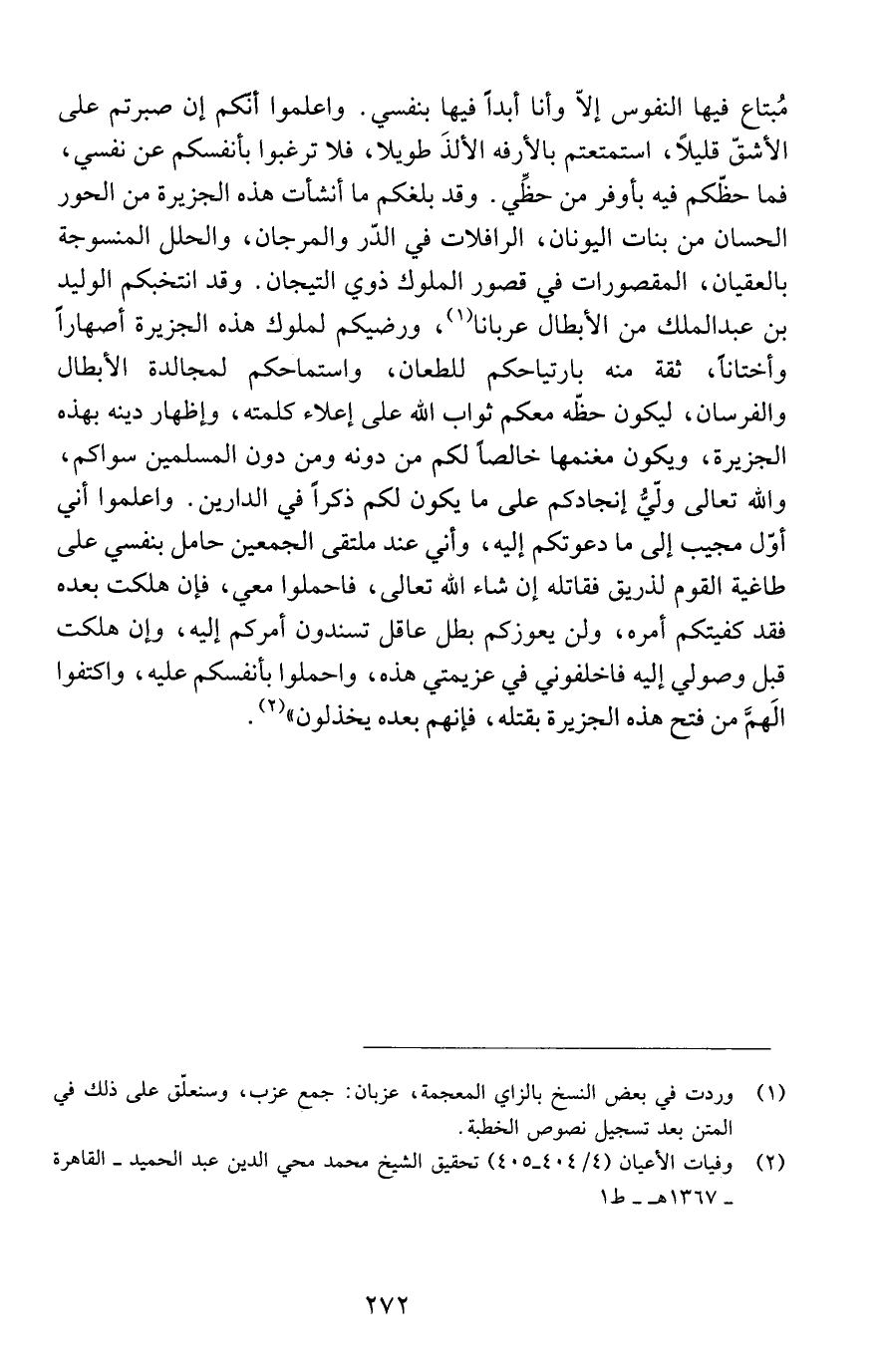 مُبتاع فيها النفوس إلاّ وأنا أبدأ فيها بنفسي. واعلموا أنكم إن صبرتم على الأشقّ قليلاً، استمتعتم بالأرفه الألذَ طويلا، فلا ترغبوا بأنفسكم عن نفسي، فما حظّكم فيه بأوفر من حظِّي. وقد بلغكم ما أنشأت هذه الجزيرة من الحور الحسان من بنات اليونان، الرافلات في الدّر والمرجان، والحلل المنسوجة بالعقيان، المقصورات في قصور الملوك ذوي التيجان. وقد انتخبكم الوليد بن عبد الملك من الأبطال عرباناً (1)، ورضيكم لملوك هذه الجزيرة أصهاراً وأختاناً، ثقة منه بارتياحكم للطعان، واستماحكم لمجالدة الأبطال والفرسان، ليكون حظّه معكم ثواب الله على إعلاء كلمته، وإظهار دينه بهذه الجزيرة، ويكون مغنمها خالصاً لكم من دونه ومن دون المسلمين سواكم، والله تعالى وليُّ إنجادكم على ما يكون لكم ذكراً في الدارين. واعلموا أني أوّل مجيب إلى ما دعوتكم إليه، وأني عند ملتقى الجمعين حامل بنفسي على طاغية القوم لذريق فقاتله إن شاء الله تعالى، فاحملوا معي، فإن هلكت بعده فقد كفيتكم أمره، ولن يعوزكم بطل عاقل تسندون أمركم إليه، وإن هلكت قبل وصولي إليه فاخلفوني في عزيمتي هذه، واحملوا بأنفسكم عليه، واكتفوا الهَمَّ من فتح هذه الجزيرة بقتله، فإنهم بعده يخذلون" (2).