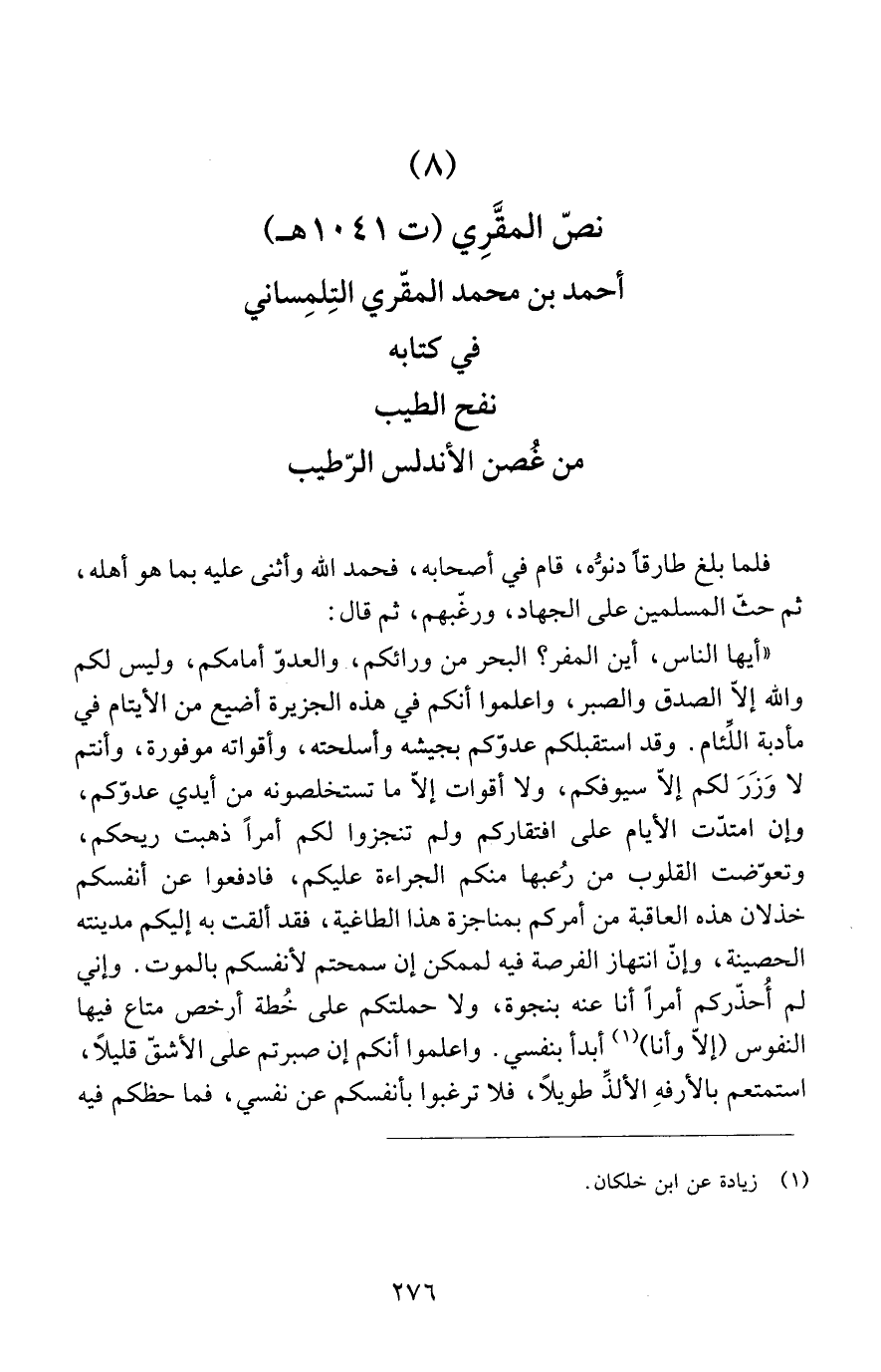 "أيها الناس، أين المفر؟ البحر من ورائكم، والعدوّ أمامكم، وليس لكم والله إلاّ الصدق والصبر، واعلموا أنكم في هذه الجزيرة أضيع من الأيتام في مأدبة اللِّئام. وقد استقبلكم عدوّكم بجيشه وأسلحته، وأقواته موفورة، وأنتم لا وَزَرَ لكم إلاّ سيوفكم، ولا أقوات إلاّ ما تستخلصونه من أيدي عدوّكم، وإن امتدّت الأيام على افتقاركم ولم تنجزوا لكم أمراً ذهبت ريحكم، وتعوّضت القلوب من رُعبها منكم الجراءة عليكم، فادفعوا عن أنفسكم خذلان هذه العاقبة من أمركم بمناجزة هذا الطاغية، فقد ألقت به إليكم مدينته الحصينة، وإنّ انتهاز الفرصة فيه لممكن إن سمحتم لأنفسكم بالموت. وإني لم أُحذّركم أمراً أنا عنه بنجوة، ولا حملتكم على خُطة أرخص متاع فيها النفوس (إلاّ وأنا) (1) أبدأ بنفسي. واعلموا أنكم إن صبرتم على الأشقّ قليلاً، استمتعم بالأرفهِ الألذِّ طويلاً، فلا ترغبوا بأنفسكم عن نفسي، فما حظكم فيه