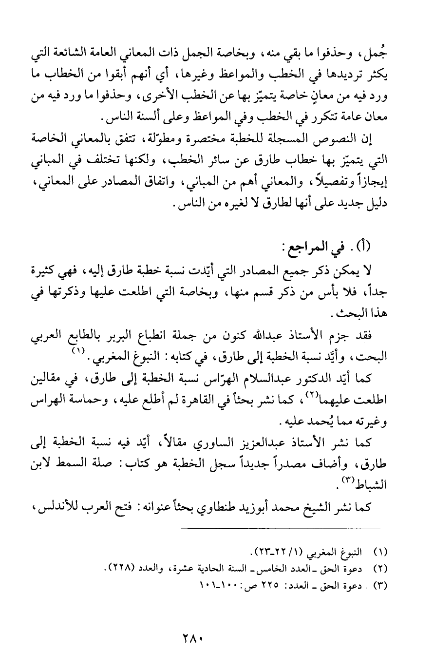 كما أيّد الدكتور عبد السلام الهرّاس نسبة الخطبة إلى طارق، في مقالين اطلعت عليهما (2)، كما نشر بحثاً في القاهرة لم أطلع عليه، وحماسة الهراس وغيرته مما يُحمد عليه.