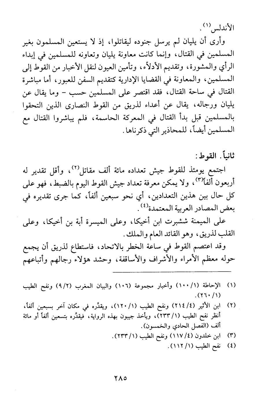 (2) ابن الأثير (4/ 214) ونفح الطيب (1/ 120)، ويقدِّره في مكان آخر بسبعين ألفاً، أنظر نفح الطيب (1/ 233)، ويأخذ جيبون بهذه الرواية، فيقدّره بتسعين ألفاً أو مائة اْلف (الفصل الحادي والخمسون).