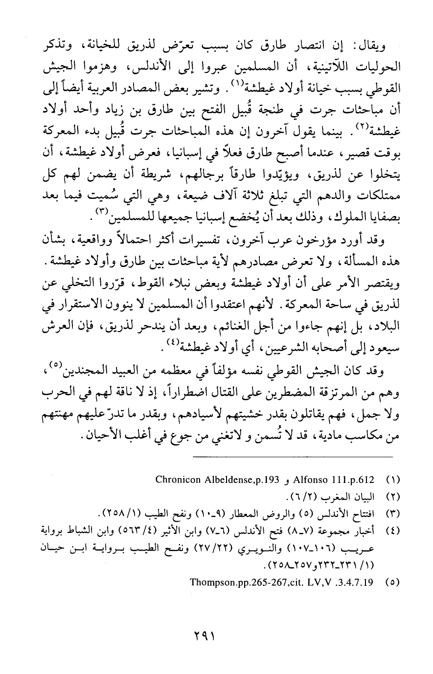 وقد أورد مؤرخون عرب آخرون، تفسيرات أكثر احتمالاً وواقعية، بشأن هذه المسألة، ولا تعرض مصادرهم لأية مباحثات بين طارق وأولاد غيطشة. ويقتصر الأمر على أن أولاد غيطشة وبعض نبلاء القوط، قرّروا التخلي عن لذريق في ساحة المعركة. لأنهم اعتقدوا أن المسلمين لا ينوون الاستقرار في البلاد، بل إنهم جاءوا من أجل الغنائم، وبعد أن يندحر لذريق، فإن العرش سيعود إلى أصحابه الشرعيين، أي أولاد غيطشة (4).