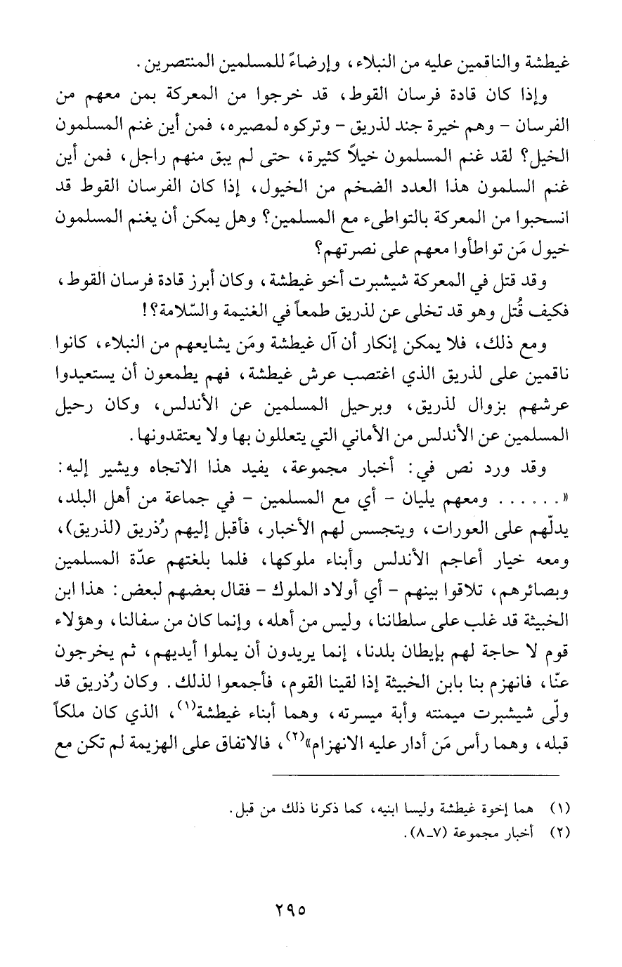 وإذا كان قادة فرسان القوط، قد خرجوا من المعركة بمن معهم من الفرسان - وهم خيرة جند لذريق - وتركوه لمصيره، فمن أين غنم المسلمون الخيل؟ لقد غنم المسلمون خيلاً كثيرة، حتى لم يبق منهم راجل، فمن أين غنم المسلمون هذا العدد الضخم من الخيول، إذا كان الفرسان القوط قد انسحبوا من المعركة بالتواطئ مع المسلمين؟ وهل يمكن أن يغنم المسلمون خيول مَن تواطأوا معهم على نصرتهم؟