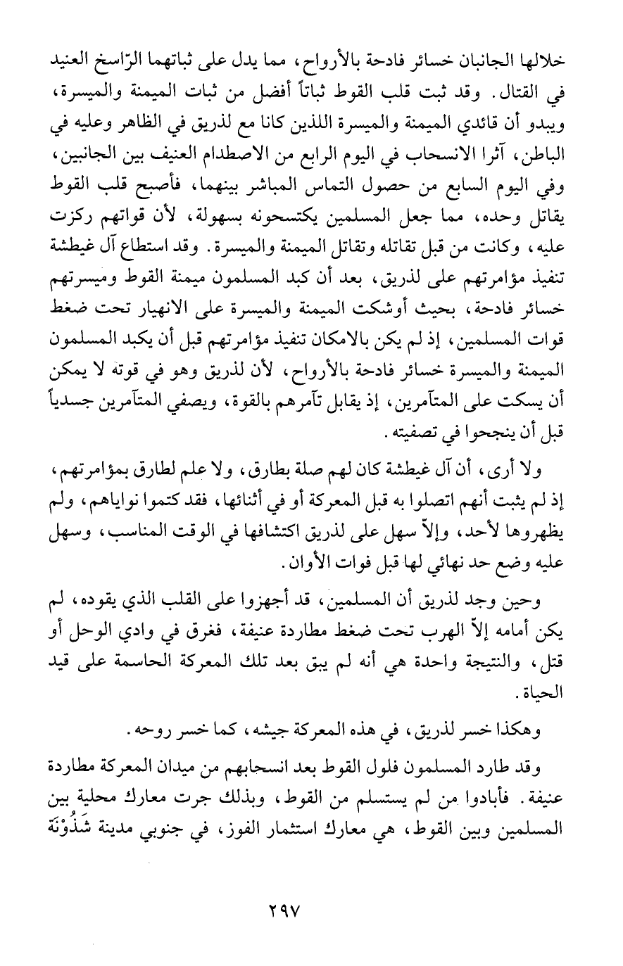 خلالها الجانبان خسائر فادحة بالأرواح، مما يدل على ثباتهما الرّاسخ العنيد في القتال. وقد ثبت قلب القوط ثباتاً أفضل من ثبات الميمنة والميسرة، ويبدو أن قائدي الميمنة والميسرة اللذين كانا مع لذريق في الظاهر وعليه في الباطن، آثرا الانسحاب في اليوم الرابع من الاصطدام العنيف بين الجانبين، وفي اليوم السابع من حصول التماس المباشر بينهما، فأصبح قلب القوط يقاتل وحده، مما جعل المسلمين يكتسحونه بسهولة، لأن قواتهم ركزت عليه، وكانت من قبل تقاتله وتقاتل الميمنة والميسرة. وقد استطاع آل غيطشة تنفيذ مؤامرتهم على لذريق، بعد أن كبد المسلمون ميمنة القوط وميسرتهم خسائر فادحة، بحيث أوشكت الميمنة والميسرة على الانهيار تحت ضغط قوات المسلمين، إذ لم يكن بالامكان تنفيذ مؤامرتهم قبل أن يكبد المسلمون الميمنة والميسرة خسائر فادحة بالأرواح، لأن لذريق وهو في قوته لا يمكن أن يسكت على المتآمرين، إذ يقابل تآمرهم بالقوة، ويصفي المتآمرين جسدياً قبل أن ينجحوا في تصفيته.