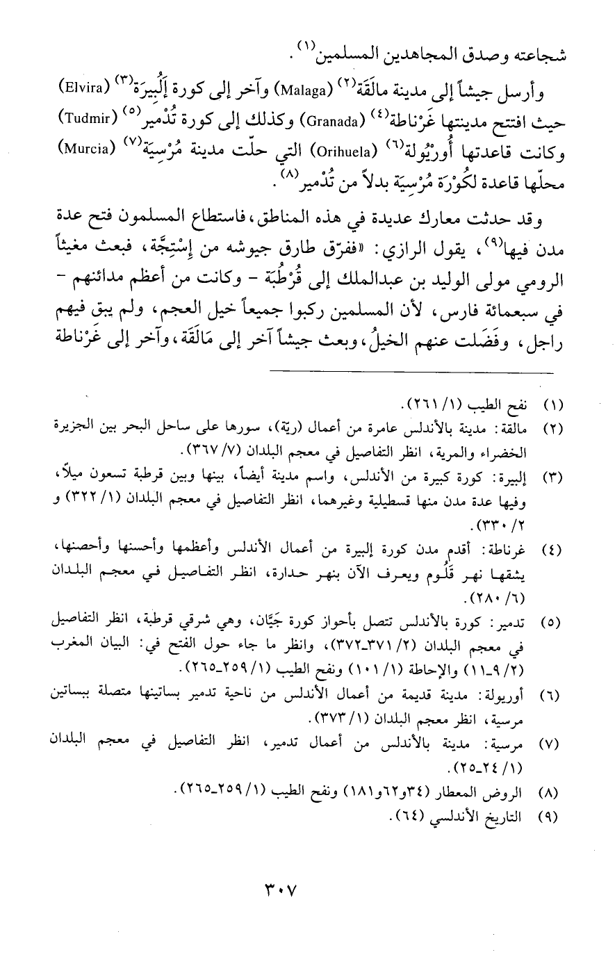 (5) تدمير: كورة بالأندلس تتصل بأحواز كورة جَيَّان، وهي شرقي قرطبة، انظر التفاصيل في معجم البلدان (2/ 371 - 372)، وانظر ما جاء حول الفتح في: البيان المغرب (2/ 9 - 11) والإحاطة (1/ 101) ونفح الطيب (1/ 259 - 265).