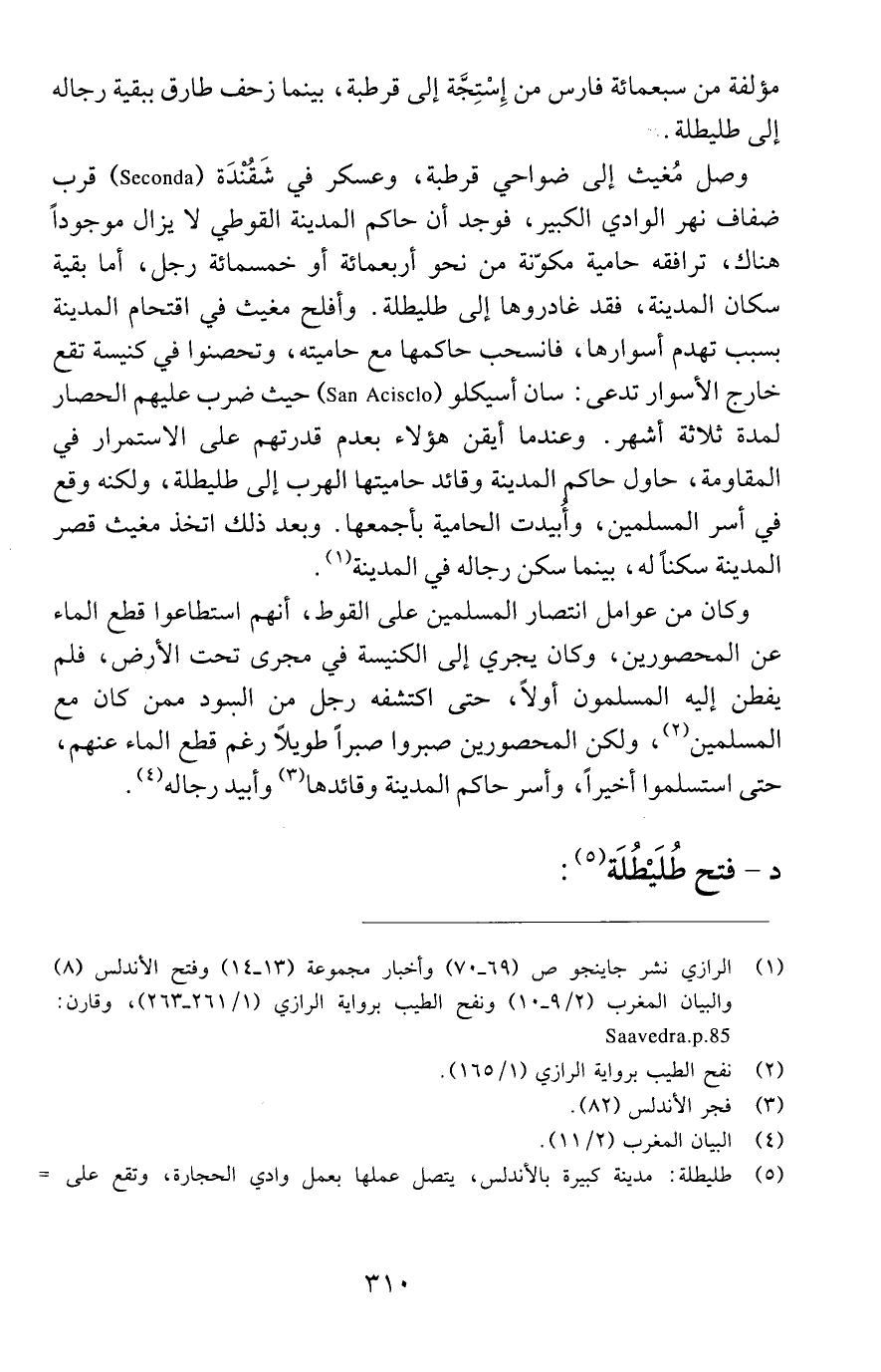 (1) الرازي نشر جاينجو ص (69 - 70) وأخبار مجموعة (13 - 14) وفتح الأندلس (8) والبيان المغرب (2/ 9 - 10) ونفح الطيب برواية الرازي (1/ 261 - 263)، وقارن: Saavedra.p.85