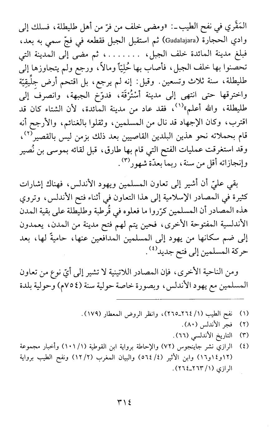 بقي عليّ أن أشير إلى تعاون المسلمين ويهود الأندلس، فهناك إشارات كثيرة في المصادر الإسلامية إلى هذا التعاون في أثناء فتح الأندلس، وتروي هذه المصادر أن المسلمين كرّروا ما فعلوه في قُرطبة وطليطلة على بقية المدن الأندلسية المفتوحة الأخرى، فحين يتم لهم فتح مدينة من المدن، يعمدون إلى ضم سكانها من يهود إلى المسلمين المدافعين عنها، حاميةً لها، بعد حركة المسلمين إلى فتح جديد (4).