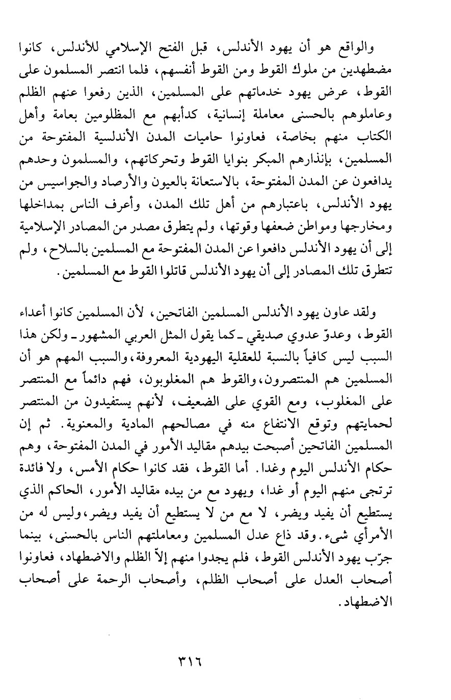 ولقد عاون يهود الأندلس المسلمين الفاتحين، لأن المسلمين كانوا أعداء القوط، وعدوّ عدوي صديقي - كما يقول المثل العربي المشهور - ولكن هذا السبب ليس كافياً بالنسبة للعقلية اليهودية المعروفة، والسبب المهم هو أن المسلمين هم المنتصرون، والقوط هم المغلوبون، فهم دائماً مع المنتصر على المغلوب، ومع القوي على الضعيف، لأنهم يستفيدون من المنتصر لحمايتهم وتوقع الانتفاع منه في مصالحهم المادية والمعنوية. ثم إن المسلمين الفاتحين أصبحت بيدهم مقاليد الأمور في المدن المفتوحة، وهم حكام الأندلس اليوم وغداً. أما القوط، فقد كانوا حكام الأمس، ولا فائدة ترتجى منهم اليوم أو غداً، ويهود مع من بيده مقاليد الأمور، الحاكم الذي يستطيع أن يفيد ويضر، لا مع من لا يستطيع أن يفيد ويضر، وليس له من الأمر أي شىء. وقد ذاع عدل المسلمين ومعاملتهم الناس بالحسنى، بينما جرّب يهود الأندلس القوط، فلم يجدوا منهم إلاّ الظلم والاضطهاد، فعاونوا أصحاب العدل على أصحاب الظلم، وأصحاب الرحمة على أصحاب الاضطهاد.