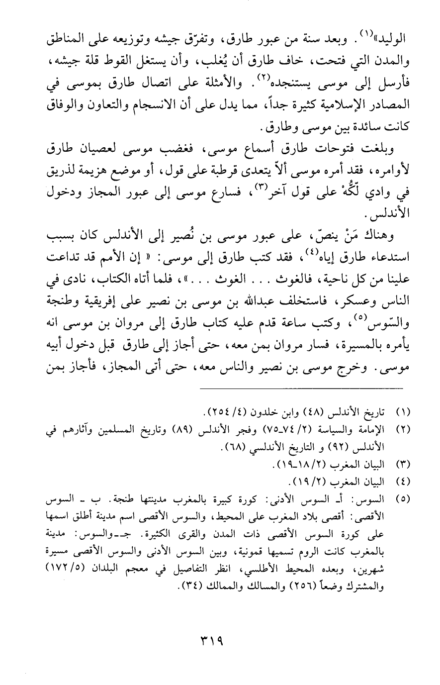 الوليد" (1). وبعد سنة من عبور طارق، وتفرّق جيشه وتوزيعه على المناطق والمدن التي فتحت، خاف طارق أن يُغلب، وأن يستغل القوط قلة جيشه، فأرسل إلى موسى يستنجده (2). والأمثلة على اتصال طارق بموسى في المصادر الإسلامية كثيرة جداً، مما يدل على أن الانسجام والتعاون والوفاق كانت سائدة بين موسى وطارق.