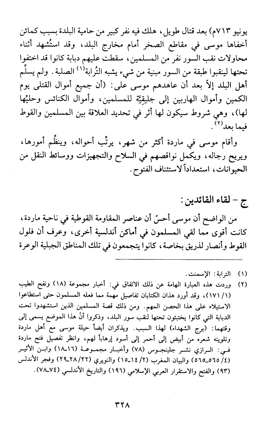 (2) وردت هذه العبارة الهامة عن ذلك الاتفاق في: أخبار مجموعة (18) ونفح الطيب (1/ 171)، وقد أورد هذان الكتابان تفاصيل مهمة مما فعله المسلمون حتى استطاعوا الاستيلاء على هذا الحصن المهم. ومن ذلك قصة المسلمين الذين استشهدوا تحت الدبابة التي كانوا يختبئون تحتها لنقب سور البلد، وذكروا أن هذا الموضع يسمى إلى وقتهما: (برج الشهداء) لهذا السبب. ويذكران أيضاً حيلة موسى مع أهل ماردة وتلوينه شعره من أبيض إلى أحمر إلى أسود إرهاباً لهم، وانظر تفصيل فتح ماردة في: الرازي نشر جلينجوس (78) وأخبار مجموعة (16 - 18) وابن الأثير (4/ 565 - 565) والبيان المغرب (2/ 14 - 15) والنويري (22/ 28 - 29) وفجر الأندلس (93) والفتح والاستقرار العربي الإسلامي (196) والتاريخ الأندلسي (74 - 78).