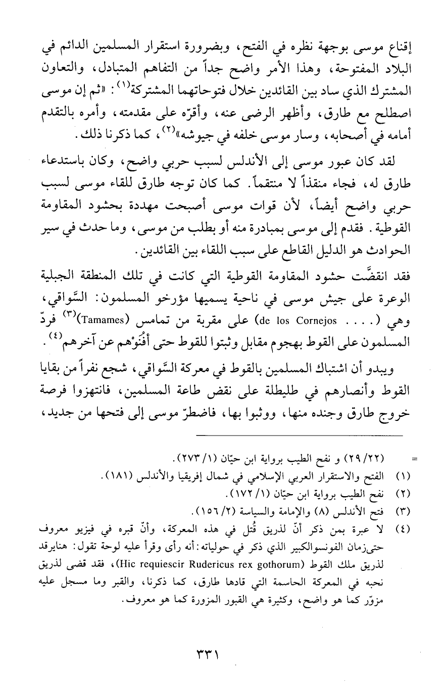(4) لا عبرة بمن ذكر أنّ لذريق قُتل في هذه المعركة، وأنّ قبره في فيزيو معروف حتى زمان الفونسو الكبير الذي ذكر في حولياته: أنه رأى وقرأ عليه لوحة تقول: هنا يرقد لذريق ملك القوط ( Hic requiescir Rudericus rex gothorum) ، فقد قضى لذريق نحبه في المعركة الحاسمة التي قادها طارق، كما ذكرنا، والقبر وما مسجل عليه مزوّر كما هو واضح، وكثيرة هي القبور المزورة كما هو معروف.