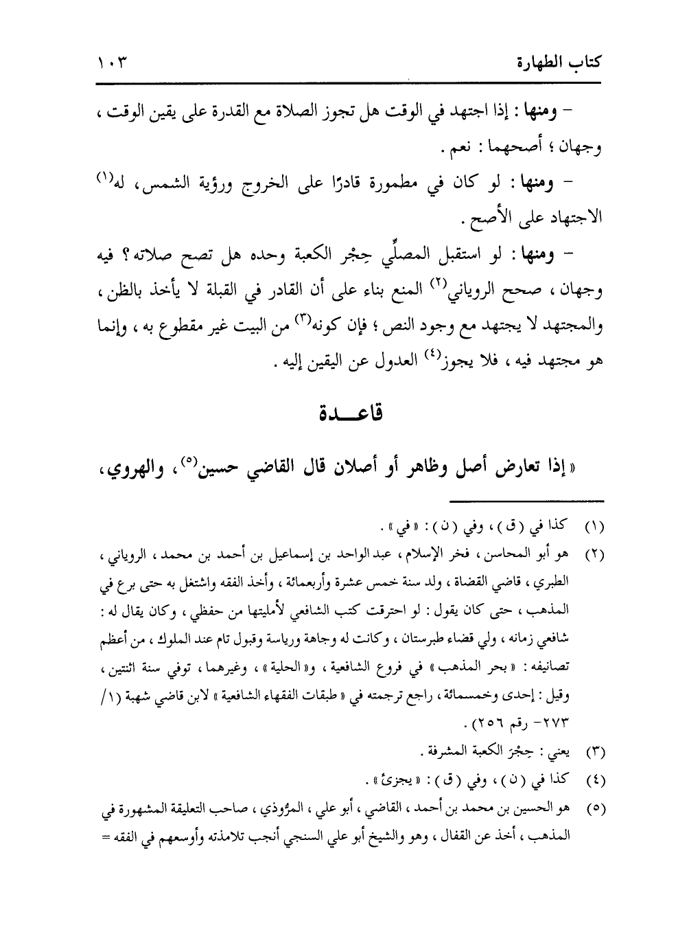 - ومنها: إذا اجتهد في الوقت هل تجوز الصلاة مع القدرة على يقين الرقت، وجهان؛ أصحهما: نعم.
