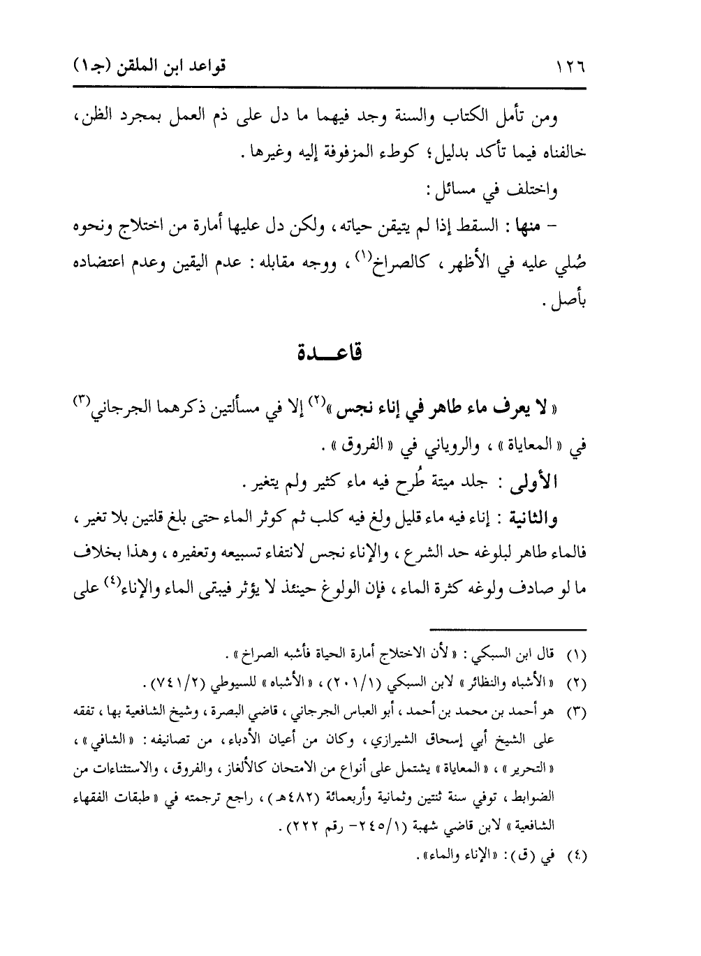 (¬3) هو أحمد بن محمد بن أحمد، أبو العباس الجرجاني، قاضي البصرة، وشيخ الشافعية بها، تفقه على الشيخ أبي إسحاق الشيرازي، وكان من أعيان الأدباء، من تصانيفه: "الشافي"، "التحرير"، "المعاياة" يشتمل على أنواع من الامتحان كالألغاز، والفروق، والاستثناءات من الضوابط، توفي سنة ثنتين وثمانية وأربعمائة (482 هـ)، راجع ترجمته في "طبقات الفقهاء الشافعية" لابن قاضي شهبة (1/ 245 - رقم 222).