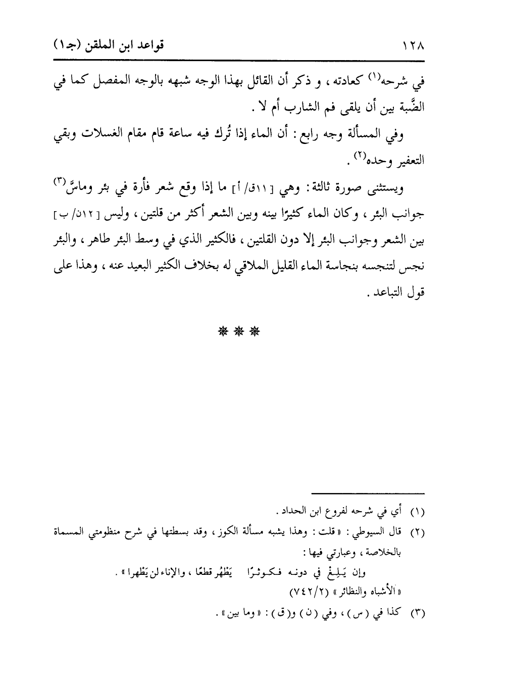 (¬2) قال السيوطي: "قلت: وهذا يشبه مسألة الكوز، وقد بسطها في شرح منظومتي المسماة بالخلاصة، وعبارتي فيها: