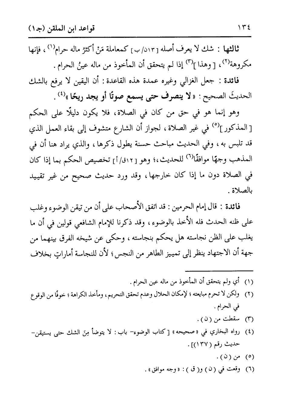 فائدة: جعل الغزالي وغيره عمدة هذه القاعدة: أن اليقين لا يرفع بالشك الحديثَ الصحيحْ "لا ينصرف حتى يسمع صوتًا أو يجد ريحًا" (¬4).