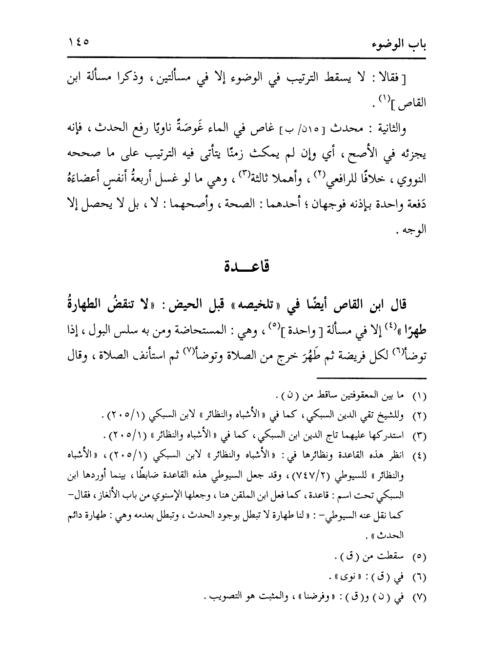 (¬4) انظر هذه القاعدة ونظائرها في: "الأشباه والنظائر" لابن السبكي (1/ 205)، "الأشباه والنظائر" للسيوطي (2/ 747)، وقد جعل السيوطي هذه القاعدة ضابطًا، بينما أوردها ابن السبكي تحت اسم: قاعدة، كما فعل ابن الملقن هنا، وجعلها الإسنوي من باب الألغاز، فقال- كما نقل عنه السيوطي-: "لنا طهارة لا تبطل بوجود الحدث، وتبطل بعدمه وهي: طهارة دائم الحدث".