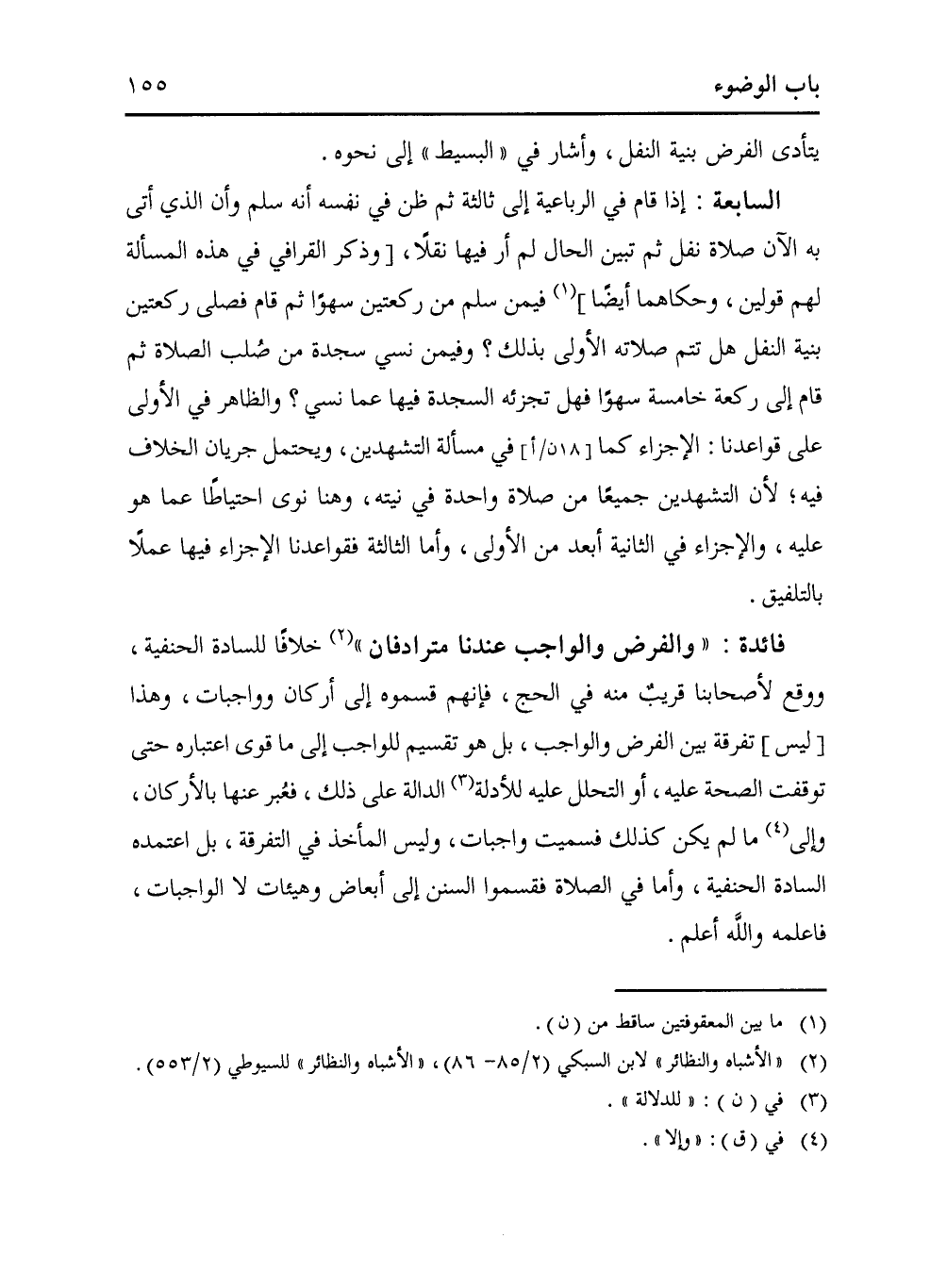 السابعة: إذا قام في الرباعية إلى ثالثة ثم ظن في نفسه أنه سلم وأن الذي أتى به الآن صلاة نفل ثم تبين الحال لم أر فيها نقلًا، [وذكر القرافي في هذه المسألة لهم قولين، وحكاهما أيضًا] (¬1) فيمن سلم من ركعتين سهوًا ثم قام فصلى ركعتين بنية النفل هل تتم صلاته الأولى بذلك؟ وفيمن نسي سجدة من صُلب الصلاة ثم قام إلى ركعة خامسة سهوًا فهل تجزئه السجدة فيها عما نسي؟ والظاهر في الأولى على قواعدنا: الإجزاء كما [18 ن / أ] في مسألة التشهدين، ويحتمل جريان الخلاف فيه؛ لأن التشهدين جميعًا من صلاة واحدة في نيته، وهنا نوى احتياطًا عما هو عليه، والإجزاء في الثانية أبعد من الأولى، وأما الثالثة فقواعدنا الإجزاء فيها عملًا بالتلفيق.