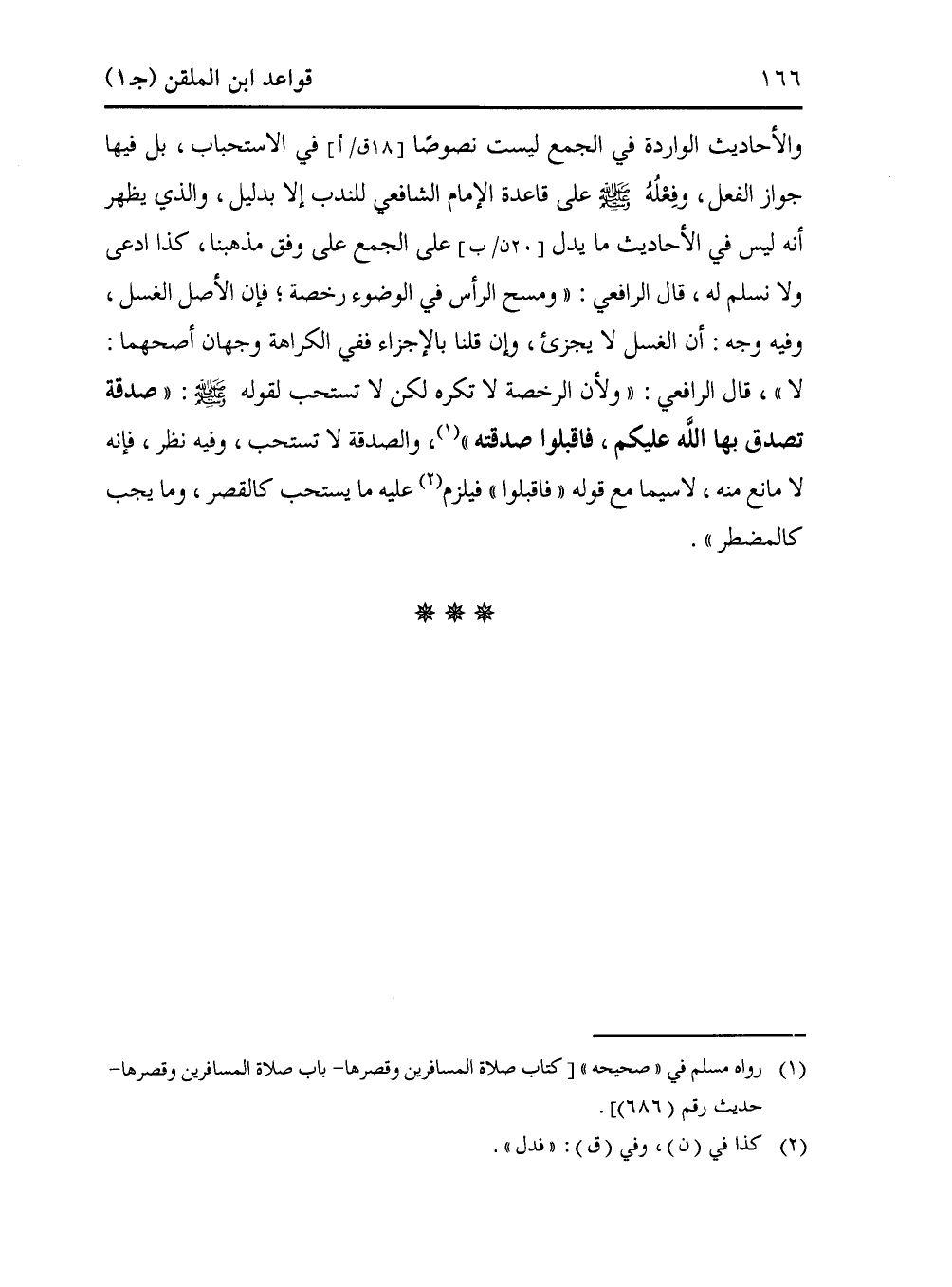 والأحاديث الواردة في الجمع ليست نصوصًا [18 ق /أ] في الاستحباب، بل فيها جواز الفعل، وفِعْلُهُ - صلى الله عليه وسلم - على قاعدة الإمام الشافعي للندب إلا بدليل، والذي يظهر أنه ليس في الأحاديث ما يدل [20 ن /ب] على الجمع على وفق مذهبنا، كذا ادعى ولا نسلم له، قال الرافعي: "ومسح الرأس في الوضوء رخصة؛ فإن الأصل الغسل، وفيه وجه: أن الغسل لا يجزئ، وإن قلنا بالإجزاء ففي الكراهة وجهان أصحهما: لا"، قال الرافعي: "ولأن الرخصة لا تكره لكن لا تستحب لقوله - صلى الله عليه وسلم -: "صدقة تصدق بها الله عليكم، فاقبلوا صدقته" (¬1)، والصدقة لا تستحب، وفيه نظر، فإنه لا مانع منه، لاسيما مع قوله "فاقبلوا" فيلزم (¬2) عليه ما يستحب كالقصر، وما يجب كالمضطر".