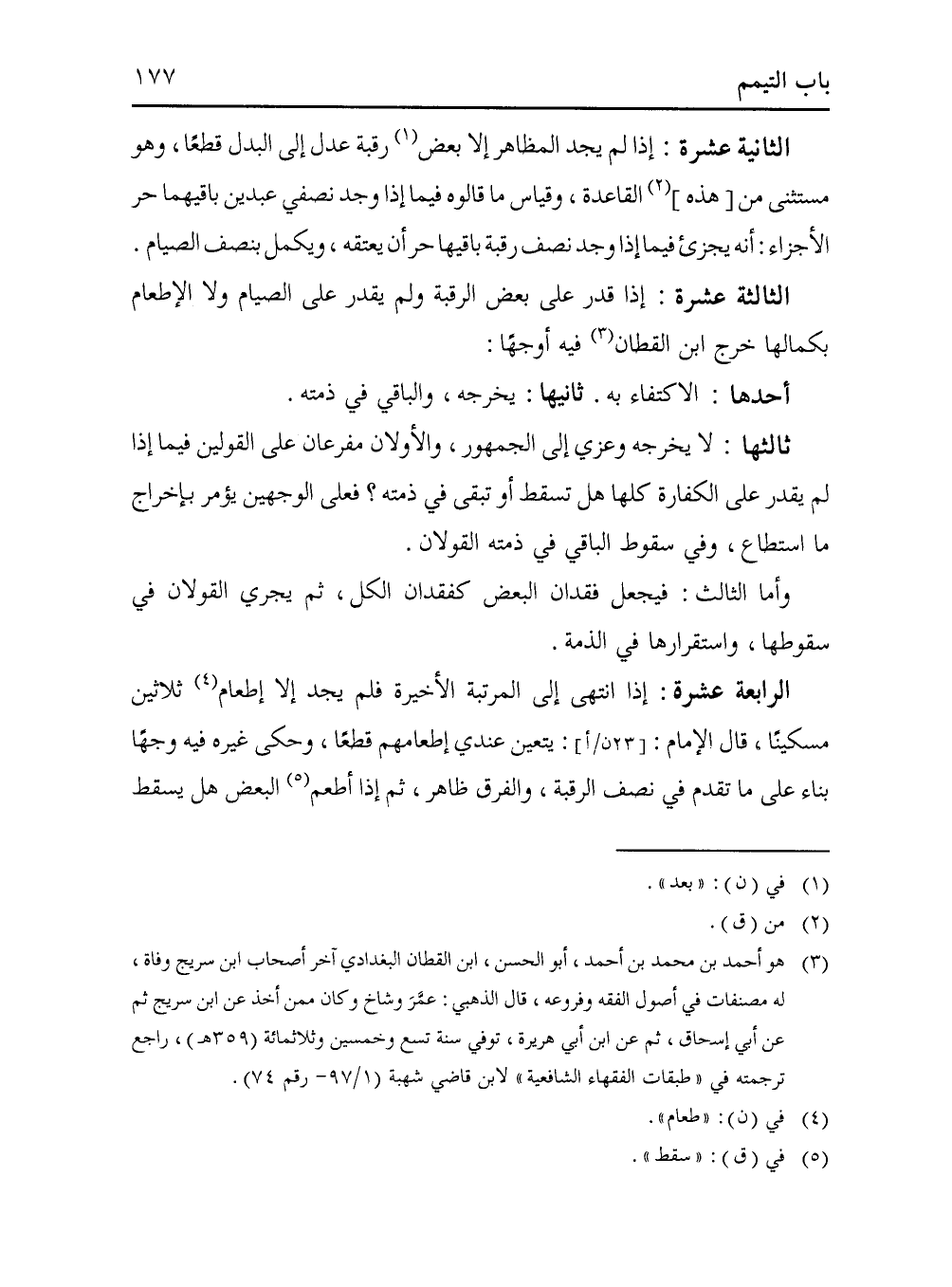 الثالثة عشرة: إذا قدر على بعض الرقبة ولم يقدر على الصيام ولا الإطعام بكمالها خرج ابن القطان (¬3) فيه أوجهًا:
