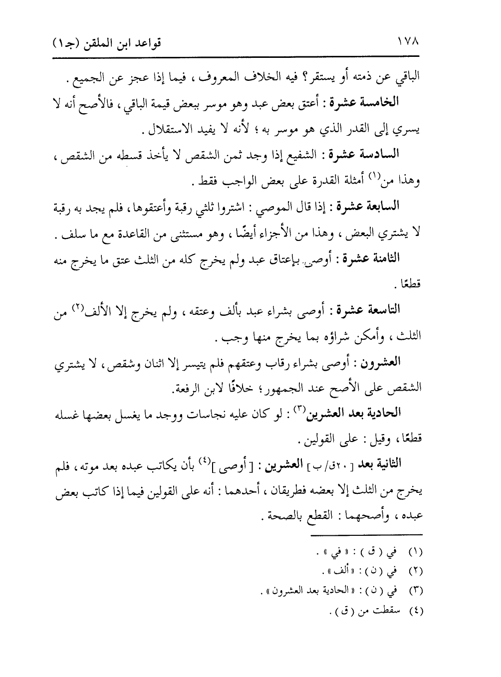 السابعة عشرة: إذا قال الموصي: اشتروا ثلثي رقبة وأعتقوها، فلم يجد به رقبة لا يشتري البعض، وهذا من الأجزاء أيضًا، وهو مستثنى من القاعدة مع ما سلف.