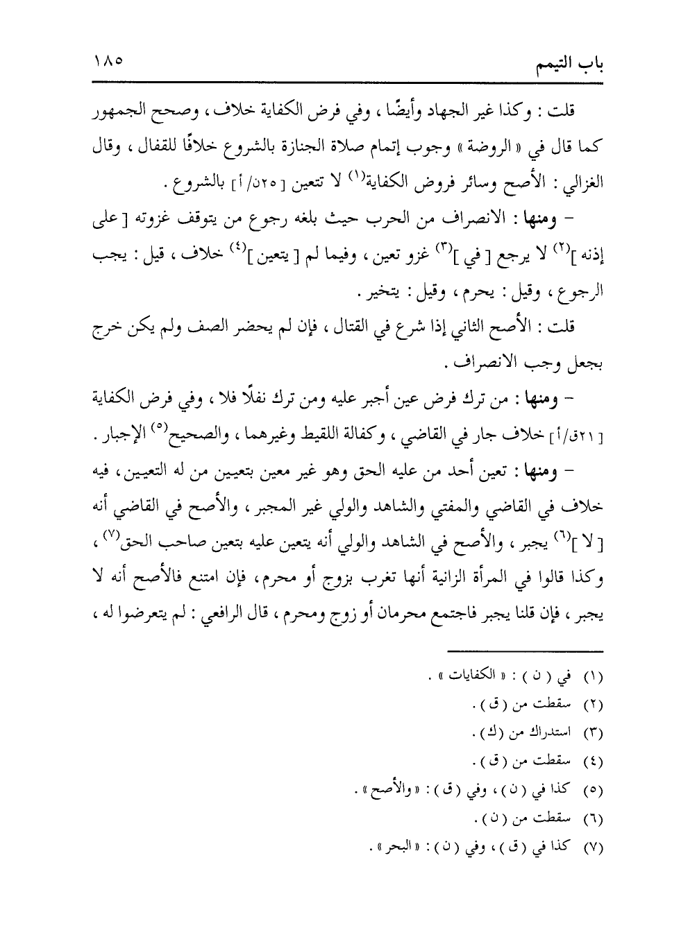 قلت: وكذا غير الجهاد وأيضًا، وفي فرض الكفاية خلاف، وصحح الجمهور كما قال في "الروضة" وجوب إتمام صلاة الجنازة بالشروع خلافًا للقفال، وقال الغزالي: الأصح وسائر فروض الكفاية (¬1) لا تتعين [25 ن/ أ] بالشروع.