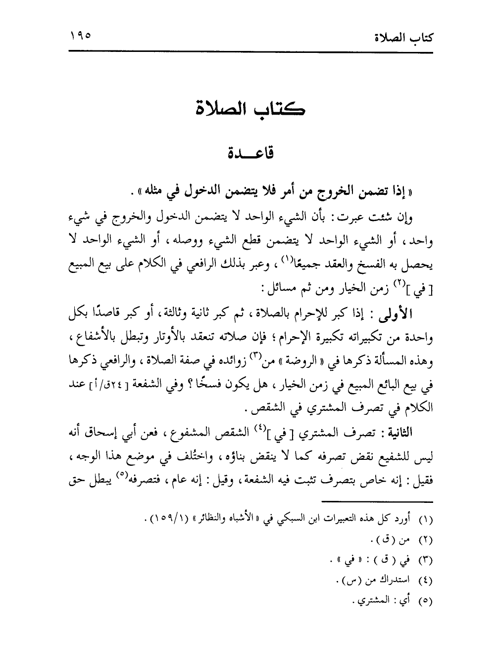وإن شئت عبرت: بأن الشيء الواحد لا يتضمن الدخول والخروج في شيء واحد، أو الشيء الواحد لا يتضمن قطع الشيء ووصله، أو الشيء الواحد لا يحصل به الفسخ والعقد جميعًا (¬1)، وعبر بذلك الرافعي في الكلام على بيع المبيع [في] (¬2) زمن الخيار ومن ثم مسائل: