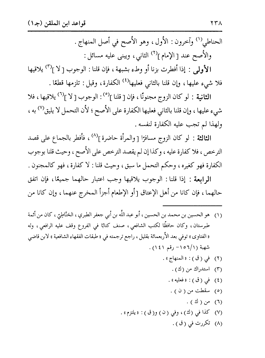 (¬1) هو الحسين بن محمد بن الحسين، أبو عبد الله بن أبي جعفر الطبري، الحَنَّاطِيّ، كان من أئمة طبرستان، وكان حافظاً لكتب الشافعي، صنف كتابًا في الفروع وقف عليه الرافعي، وله "الفتاوى" توفي بعد الأربعمائة بقليل، راجع ترجمته في "طبقات الفقهاء الشافعية" لابن قاضي شهبة (1/ 156 - رقم 141).