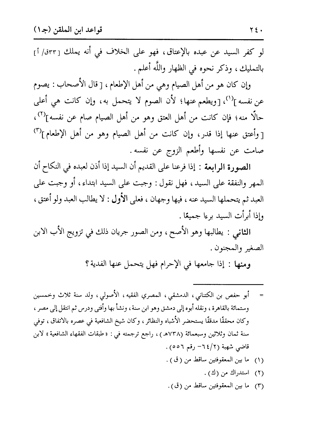 = أبو حفص بن الكتناني، الدمشقي، المصري الفقيه، الأصولي، ولد سنة ثلاث وخمسين وستمائة بالقاهرة، ونقله أبوه إلى دمشق وهو ابن سنة، ونشأ بها وأفتى ودرس ثم انتقل إلى مصر، وكان محققاً مدققاً يستحضر الأشباه والنظائر، وكان شيخ الشافعية في عصره بالاتفاق، توفي سنة ثمان وثلاثين وسبعمائة (738 هـ)، راجع ترجمته في: "طبقات الفقهاء الشافعية" لابن قاضي شهبة (2/ 64 - رقم 556).