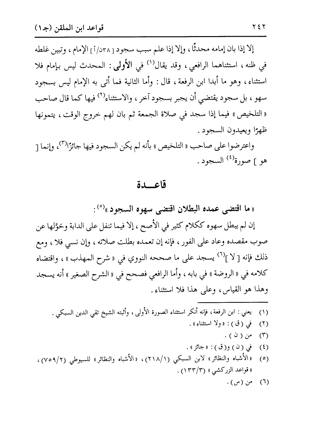 إلا إذا بان إمامه محدثًا، وإلا إذا علم سبب سجود [38 ن/ أ] الإمام، وتبين غلطه في ظنه، استثناهما الرافعي، وقد يقال (¬1) في الأولى: المحدث ليس بإمام فلا استثناء، وهو ما أبدا ابن الرفعة، قال: وأما الثانية فما أتى به الإمام ليس بسجود سهو، بل سجود يقتضي أن يجبر بسجود آخر، والاستثناء (¬2) فيها كما قال صاحب "التلخيص" فيما إذا سجد في صلاة الجمعة ثم بان لهم خروج الوقت، يتمونها ظهرًا ويعيدون السجود.