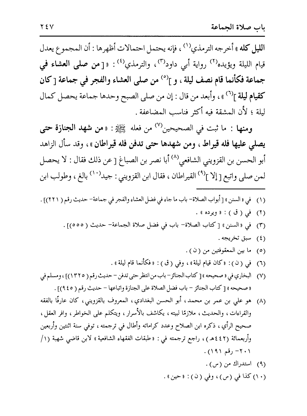 ومنها: ما ثبت في الصحيحين (¬7) من فعله - صلى الله عليه وسلم -: "من شهد الجنازة حتى يصلي عليها فله قيراط، ومن شهدها حتى تدفن فله قيراطان"، وقد سأل الزاهد أبو الحسن بن القزويني الشافعي (¬8) أبا نصر بن الصباغ [عن ذلك فقال: لا يحصل لمن صلى واتبع [إلا] (¬9) القيراطان، فقال ابن القزويني: جيد (¬10) بالغ، وطولب ابن
