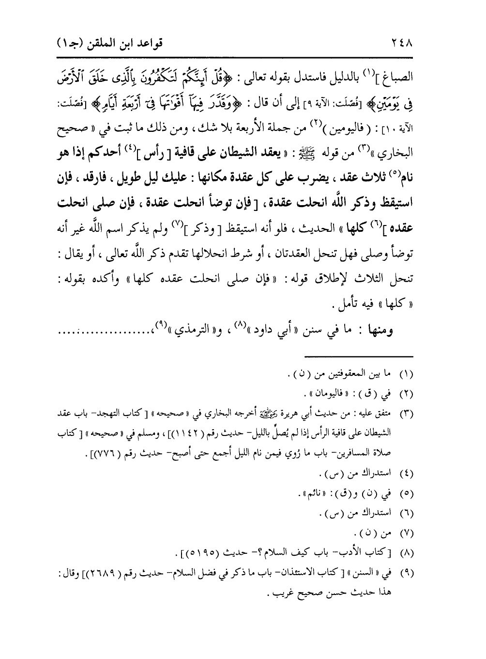 الصباغ] (¬1) بالدليل فاستدل بقوله تعالى: {قُلْ أَئِنَّكُمْ لَتَكْفُرُونَ بِالَّذِي خَلَقَ الْأَرْضَ في يَوْمَيْنِ} [فصلت: الآية 9] إلى أن قال: {وَقَدَّرَ فِيهَا أَقْوَاتَهَا في أَرْبَعَةِ أَيَّامٍ} [فصلت: الآية 10]: (فاليومين) (¬2) من جملة الأربعة بلا شك، ومن ذلك ما ثبت في "صحيح البخاري" (¬3) من قوله - صلى الله عليه وسلم -: "يعقد الشيطان على قافية [رأس] (¬4) أحدكم إذا هو نام (¬5) ثلاث عقد، يضرب على كل عقدة مكانها: عليك ليل طويل، فارقد، فإن استيقظ وذكر الله انحلت عقدة، [فإن توضأ انحلت عقدة، فإن صلى انحلت عقده] (¬6) كلها" الحديث، فلو أنه استيقظ [وذكر] (¬7) ولم يذكر اسم الله غير أنه توضأ وصلى فهل تنحل العقدتان، أو شرط انحلالها تقدم ذكر الله تعالى، أو يقال: تنحل الثلاث لإطلاق قوله: "فإن صلى انحلت عقده كلها" وأكده بقوله: "كلها" فيه تأمل.