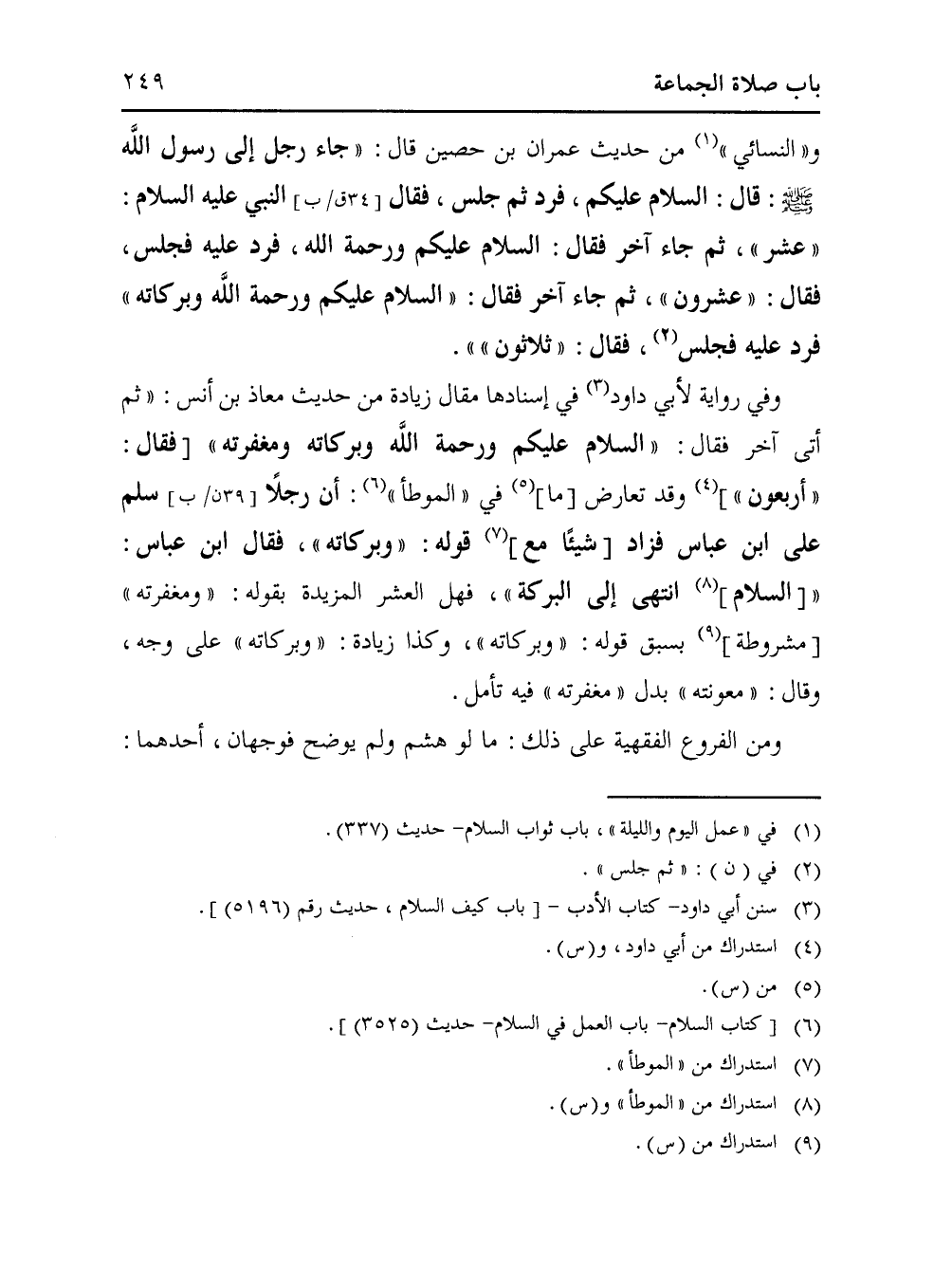 و "النسائي" (¬1) من حديث عمران بن حصين قال: "جاء رجل إلى رسول الله - صلى الله عليه وسلم -: قال: السلام عليكم، فرد ثم جلس، فقال [34 ق/ ب] النبي - عليه السلام -: "عشر"، ثم جاء آخر فقال: السلام عليكم ورحمة الله، فرد عليه فجلس، فقال: "عشرون"، ثم جاء آخر فقال: "السلام عليكم ورحمة الله وبركاته" فرد عليه فجلس (¬2)، فقال: "ثلاثون"".