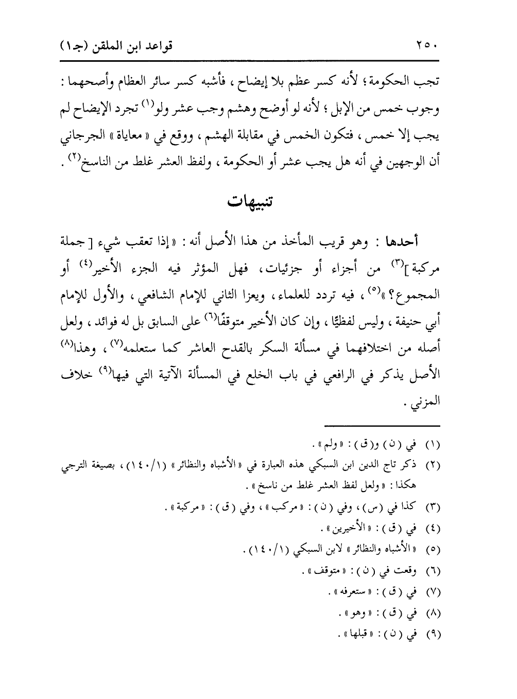 (¬2) ذكر تاج الدين ابن السبكي هذه العبارة في "الأشباه والنظائر" (1/ 140)، بصيغة الترجي هكذا: "ولعل لفظ العشر غلط من ناسخ".