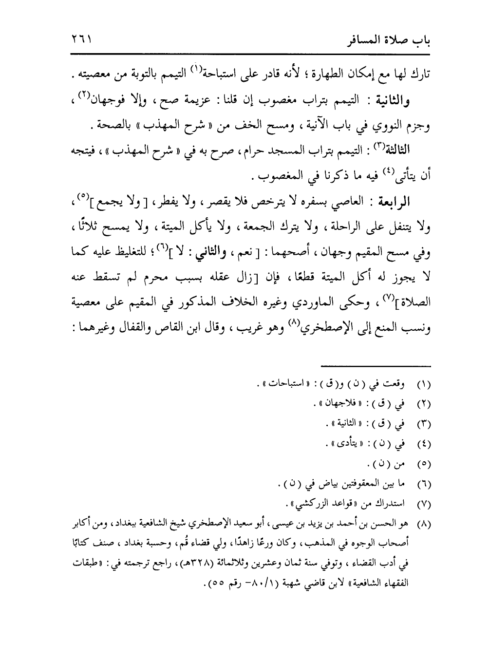(¬8) هو الحسن بن أحمد بن يزيد بن عيسى، أبو سعيد الإصطخري شيخ الشافعية ببغداد، ومن أكابر أصحاب الوجوه في المذهب، وكان ورعًا زاهدًا، ولي قضاء قُم، وحسبة بغداد، صنف كتابًا في أدب القضاء، وتوفي سنة ثمان وعشرين وثلاثمائة (328 هـ)، راجع ترجمته في: "طبقات الفقهاء الشافعية" لابن قاضي شهبة (1/ 80 - رقم 55).