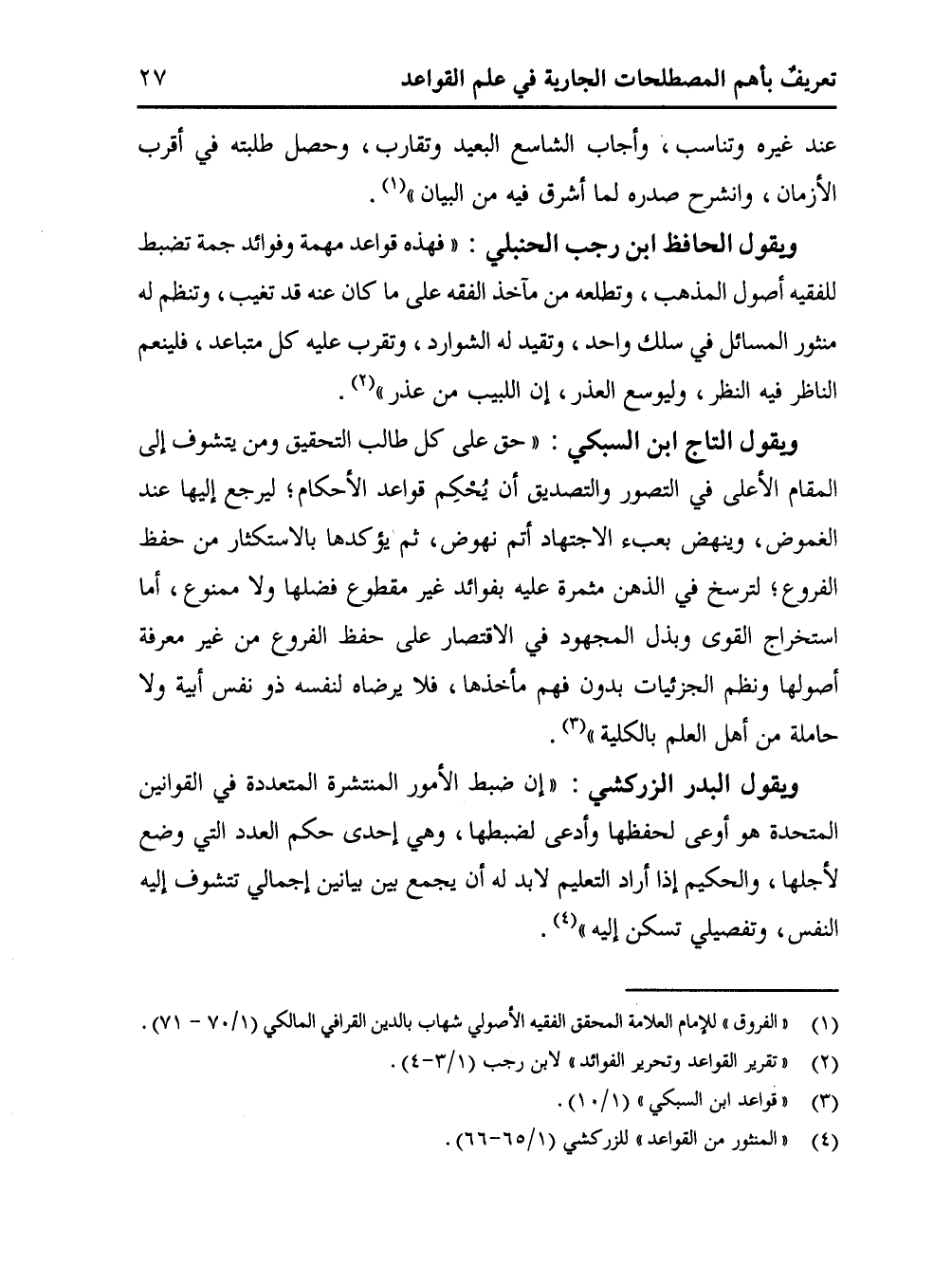 وبقول الحافظ ابن رجب الحنبلي: "فهذه قواعد مهمة وفوائد جمة تضبط للفقيه أصول المذهب، وتطلعه من مآخذ الفقه على ما كان عنه قد تغيب، وتنظم له منثور المسائل في سلك واحد، وتقيد له الشوارد، وتقرب عليه كل متباعد، فلينعم الناظر فيه النظر، وليوسع العذر، إن اللبيب من عذر" (¬2).
