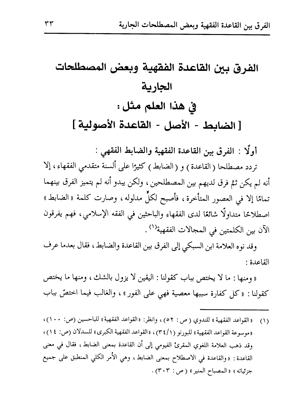 (¬1) "القواعد الفقهية" للندوي (ص: 52)، وانظر: "القواعد الفقهية" للباحسين (ص: 100)، "موسوعة القواعد الفقهية" للبورنو (1/ 34)، "القواعد الفقهية الكبرى" للسدلان (ص: 14)، وقد ذهب العلامة اللغوي المقرئ الفيومي إلى أن القاعدة بمعنى الضابط، فقال في معنى القاعدة: "والقاعدة في الاصطلاح بمعنى الضابط، وهي الأمر الكلي المنطبق على جميع جزئياته" "المصباح المنير" (ص: 303).